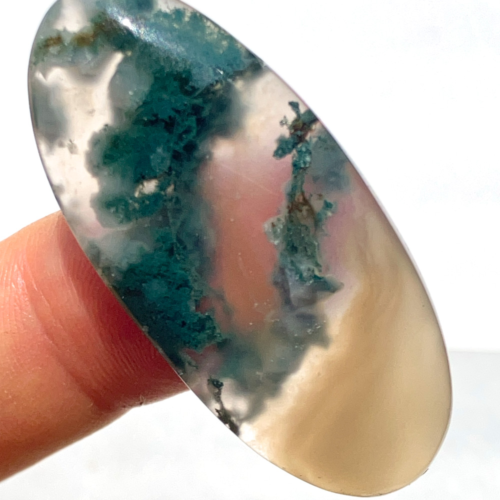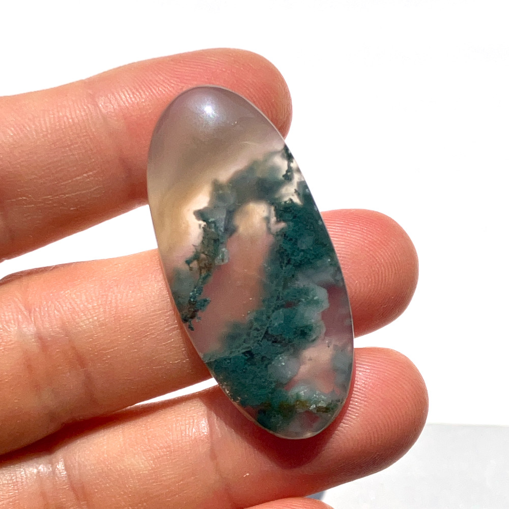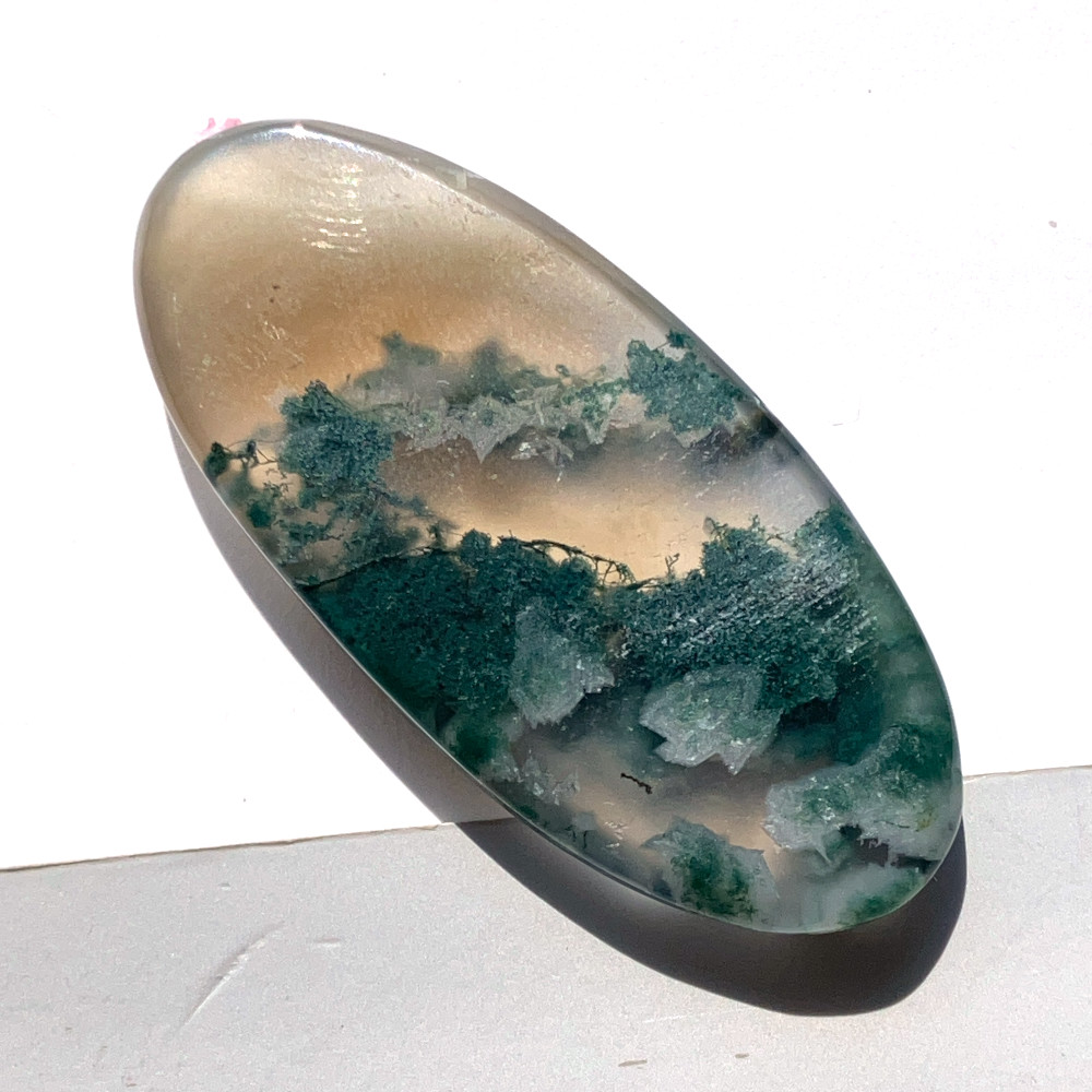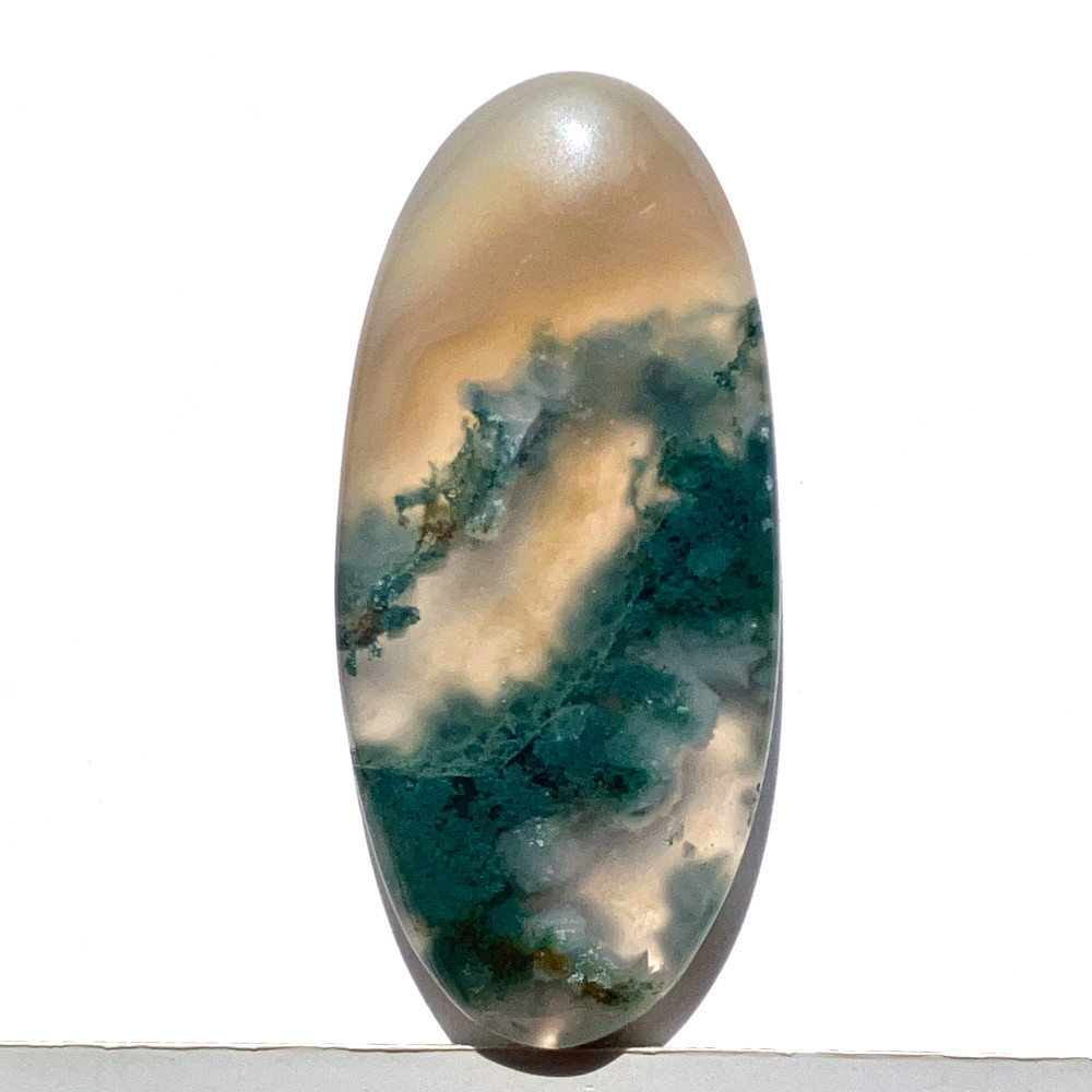 深い緑の苔状模様がのびやかに広がる、縦長の楕円形のモスアゲートです。