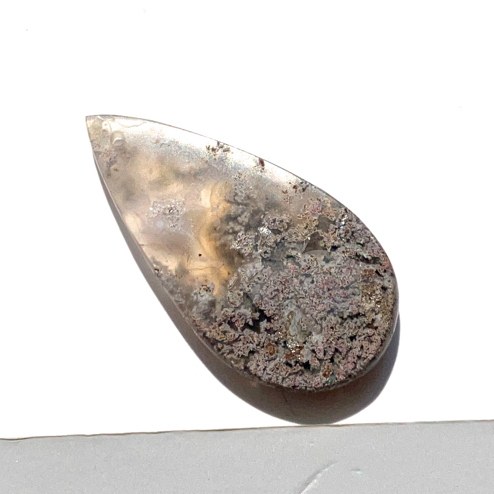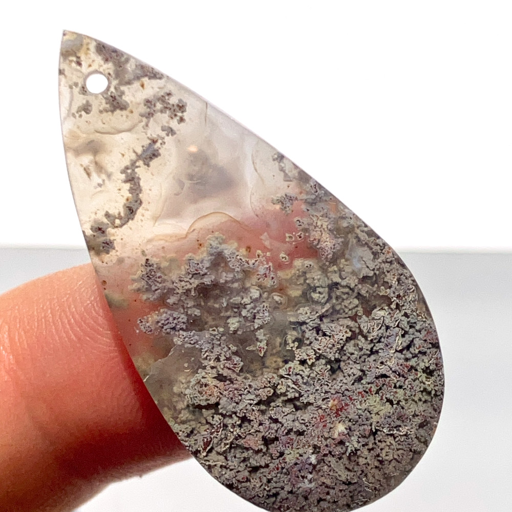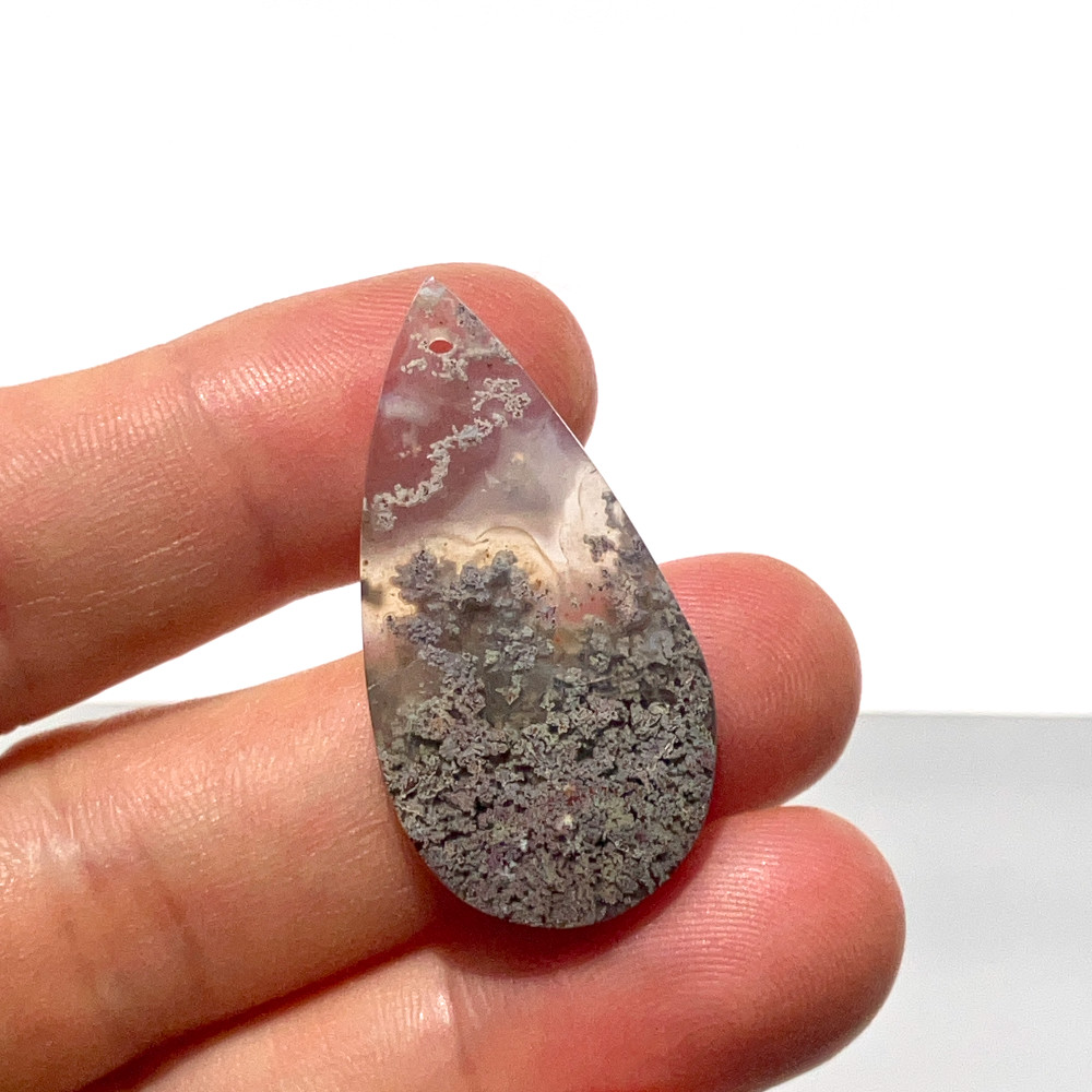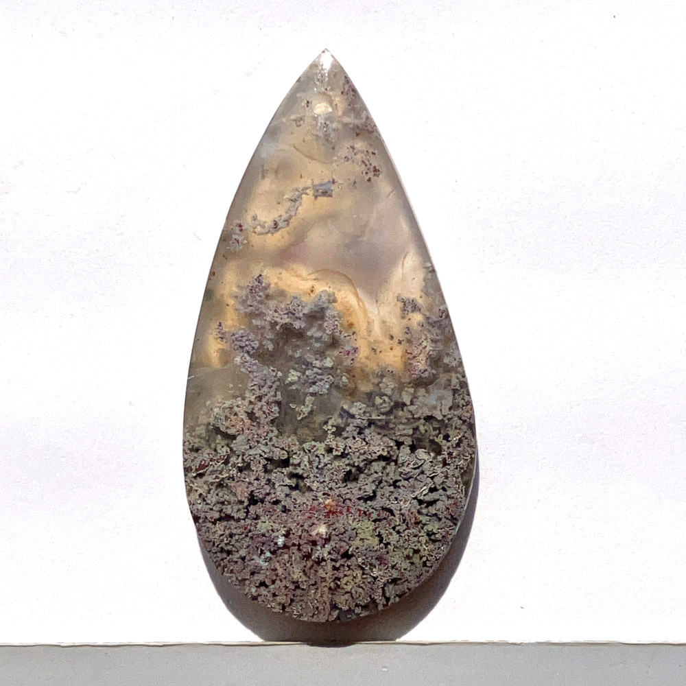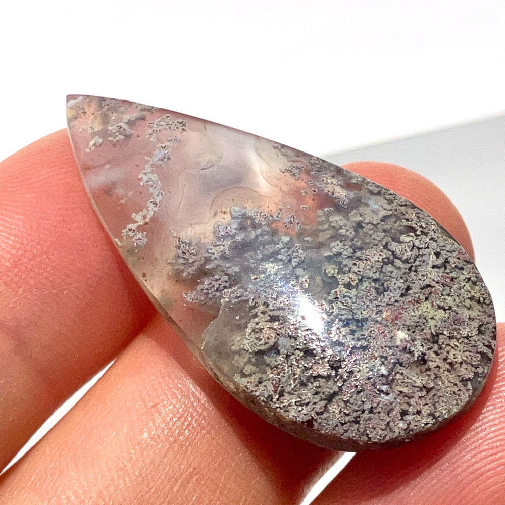 透明感のあるベースにグレーがかったモスインクルージョンが広がり、下部に細かな苔状模様が集まっています。