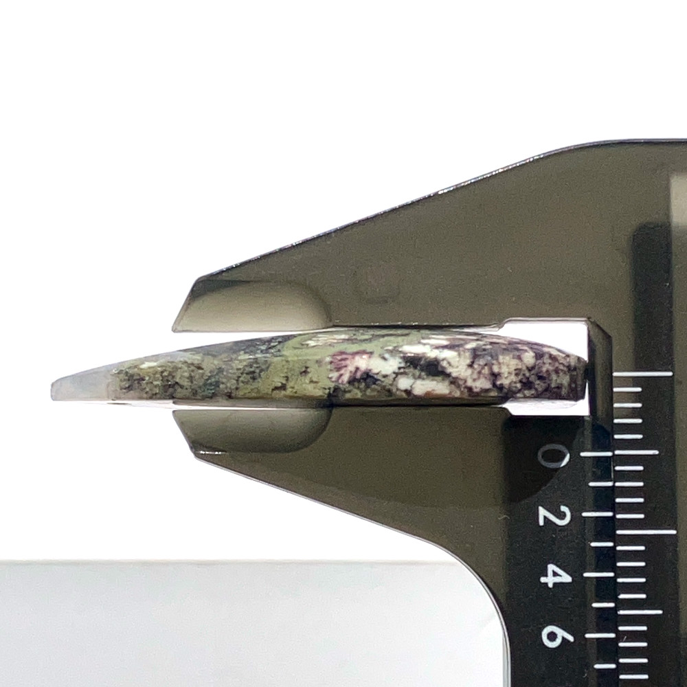 透明感のある乳白色の母岩に、グリーンやホワイトのインクルージョンが広がり、苔が茂るように見える部分や枝葉のような1点ものの模様を楽しめます。