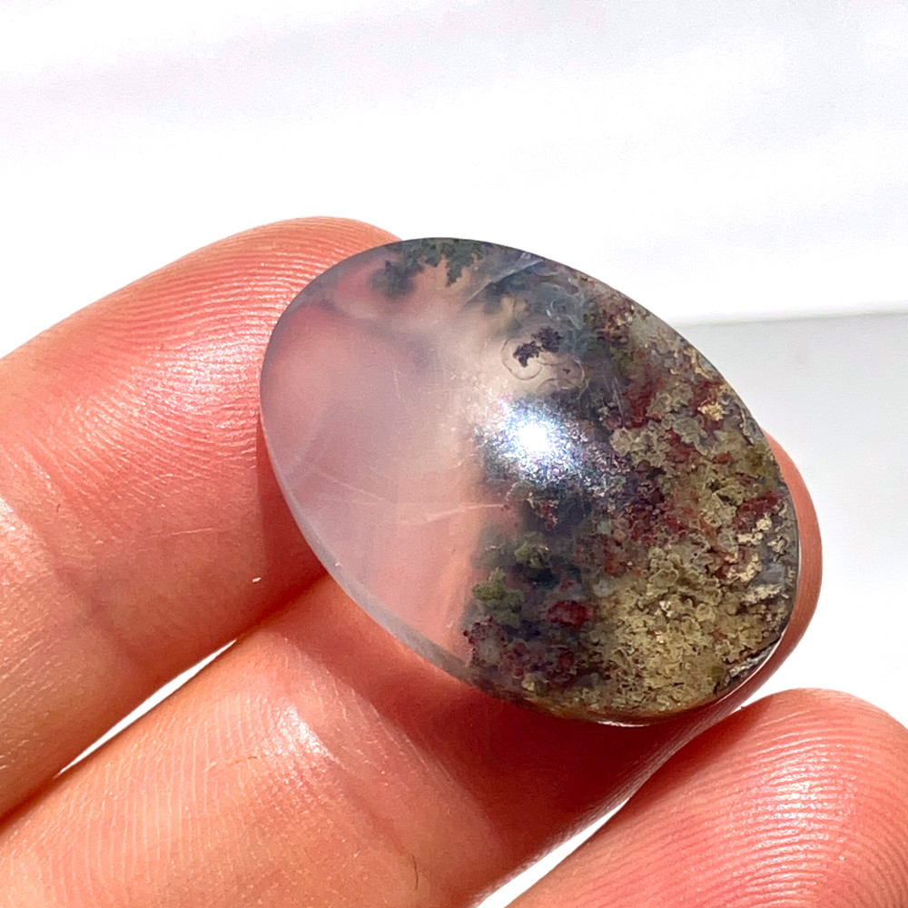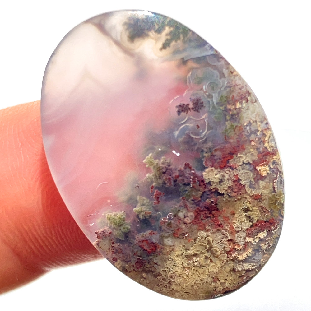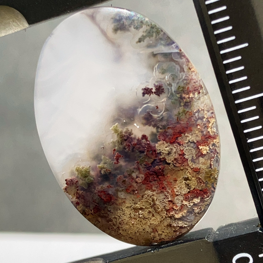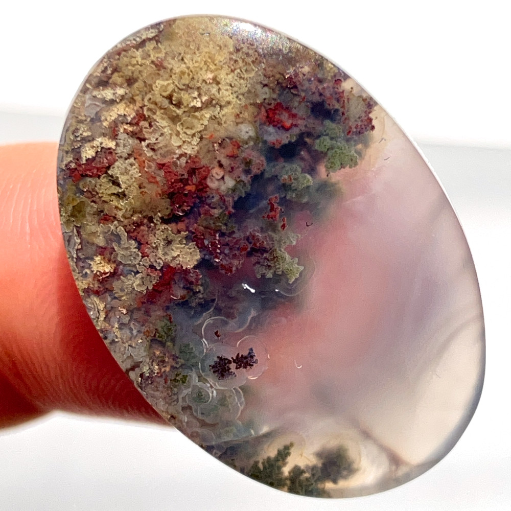 透明感のあるベースに、赤褐色や緑色のモスインクルージョンが広がり、苔むした丘陵や秋の森を思わせる風景を描いたようなモスアゲートの楕円形ルースです。