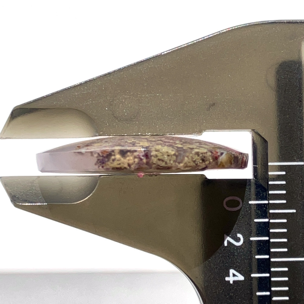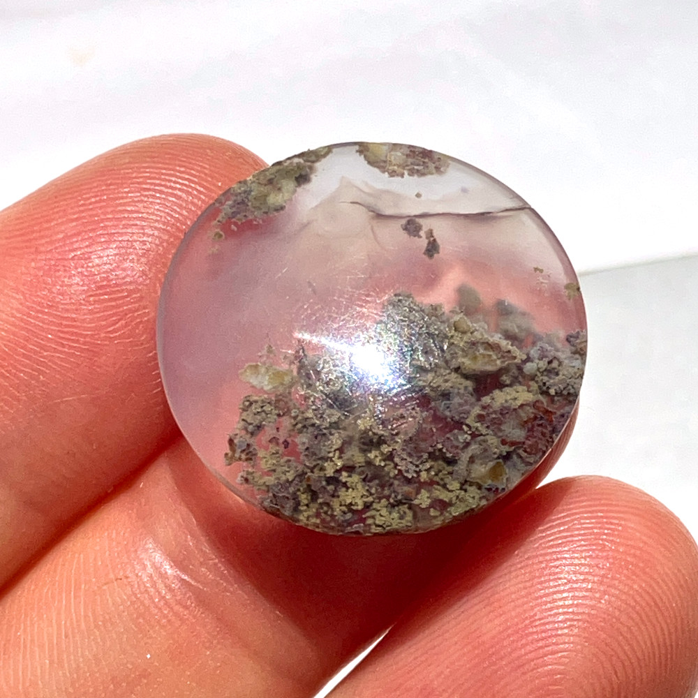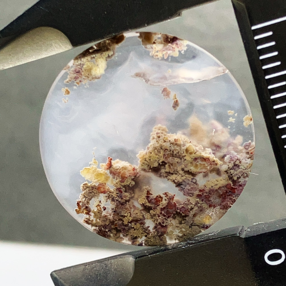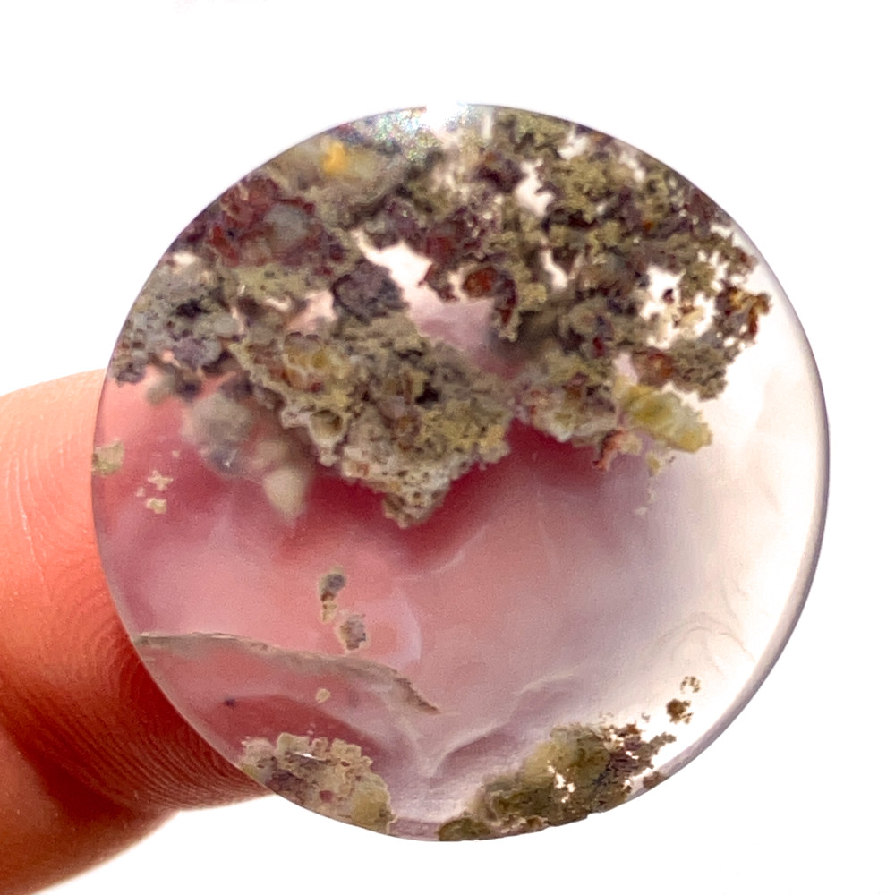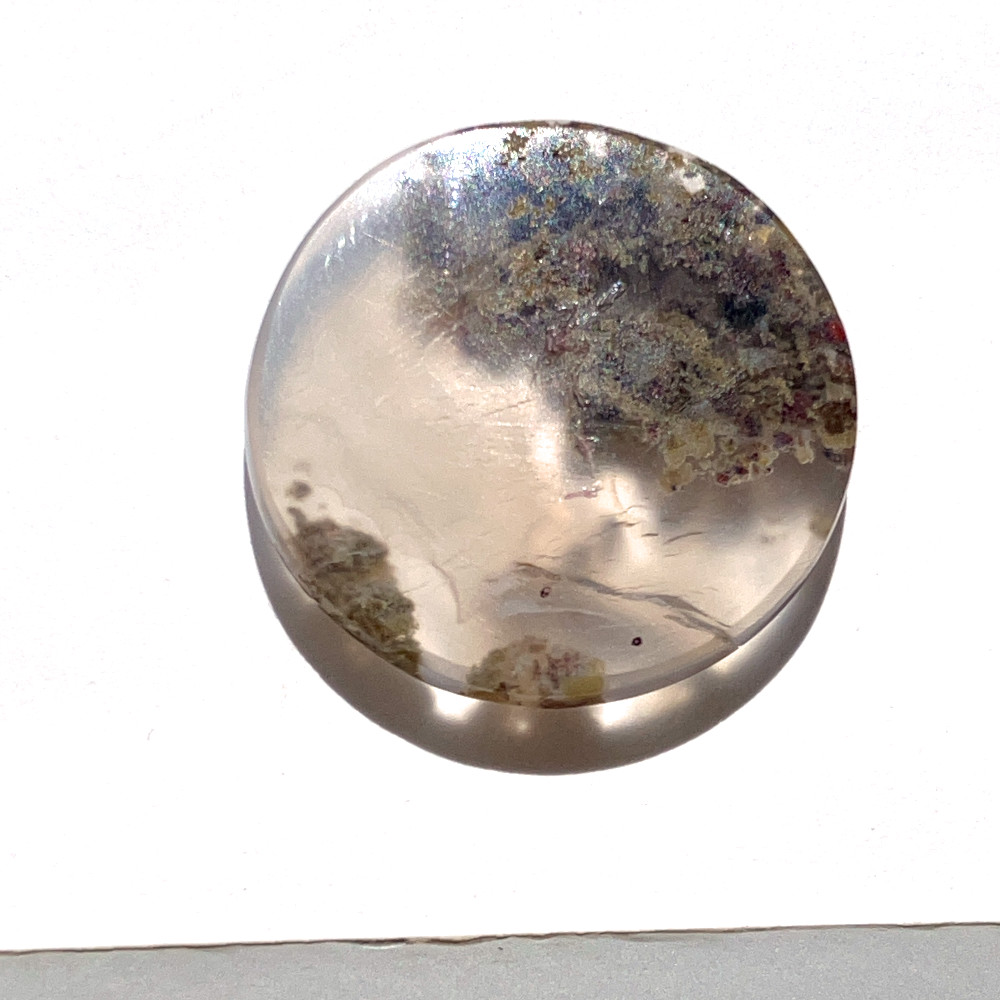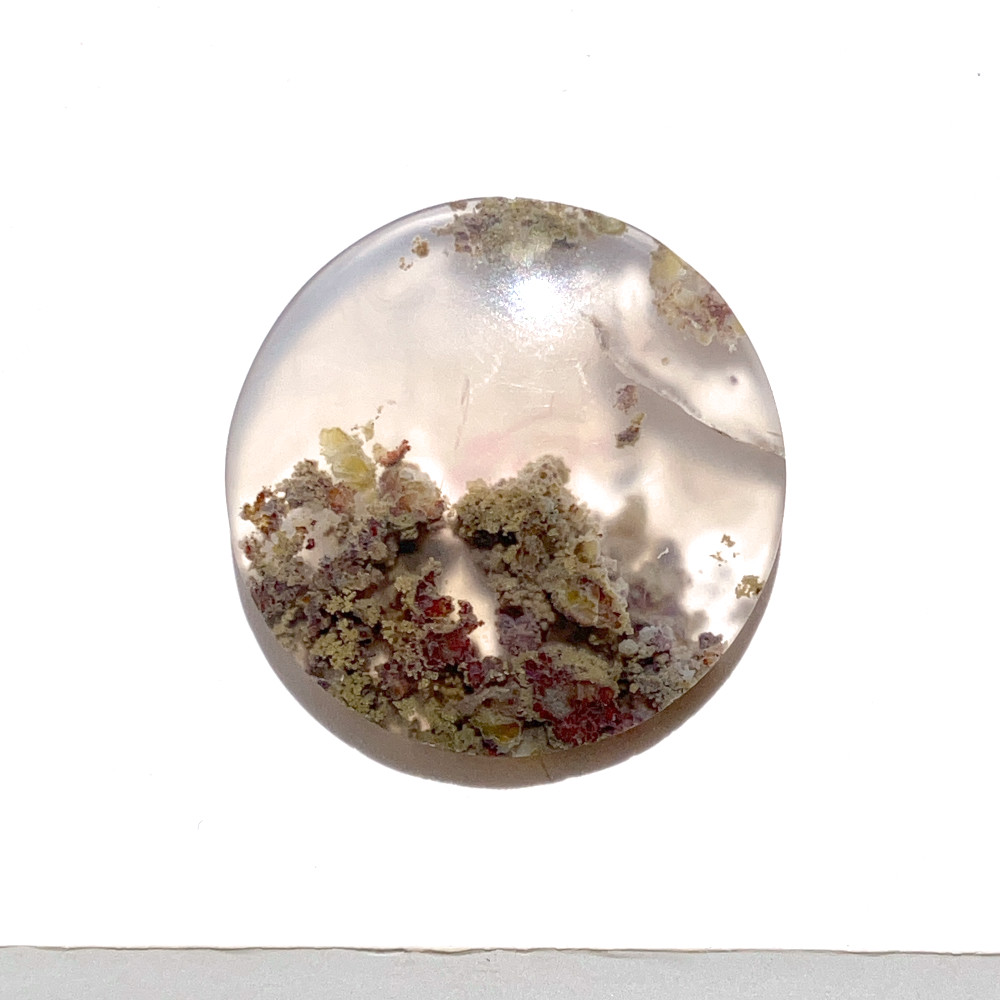 透明感のあるベースに、赤褐色や黄緑色のインクルージョンが下部を中心に広がり、苔むした大地を切り取ったような表情を見せるモスアゲートの円形ルースです。