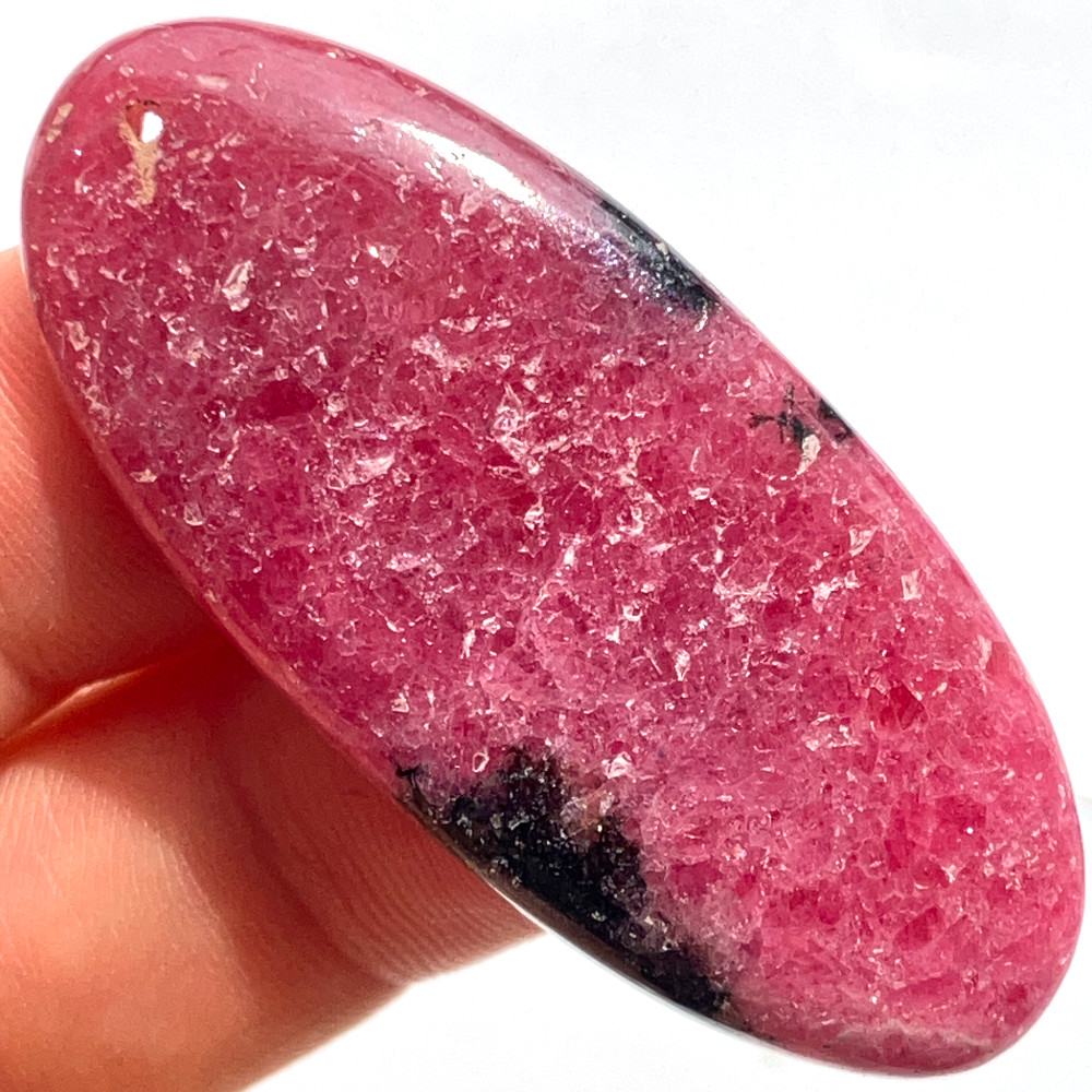 落ち着いた深いピンク色の地に、光の加減できらりと微細な粒子が輝く様子が美しい、ロードナイトの大き目な楕円形ルースです。