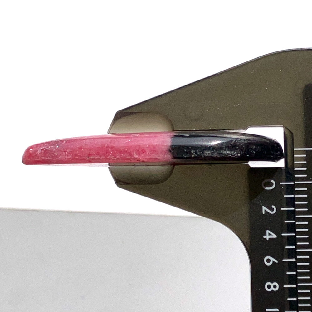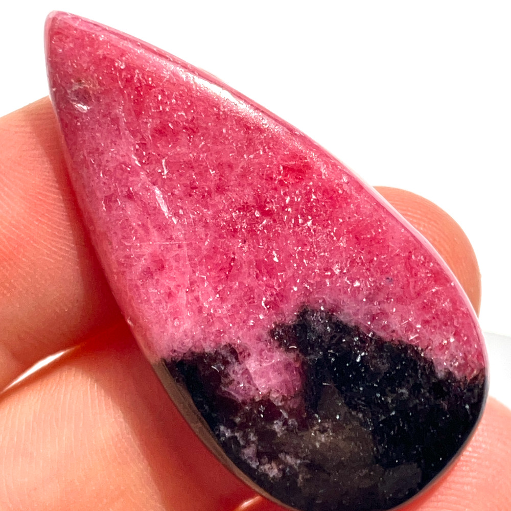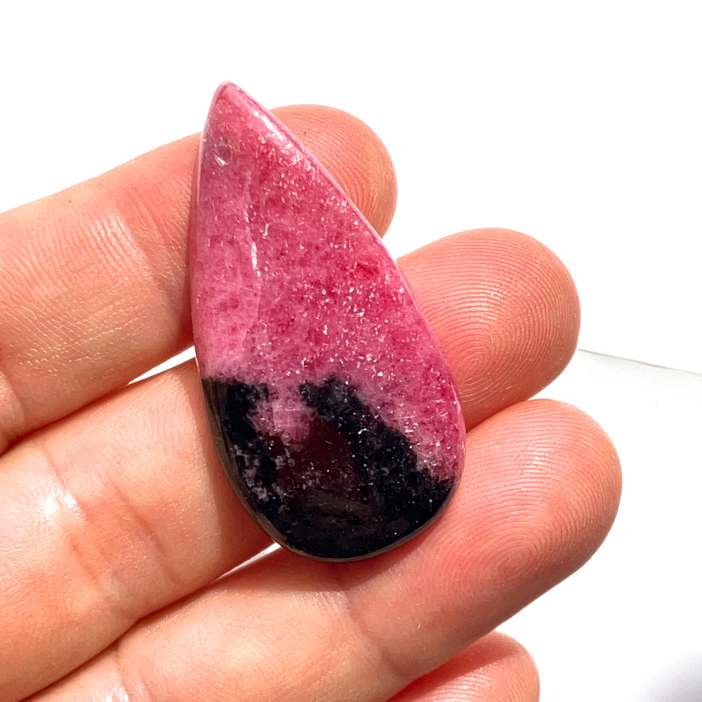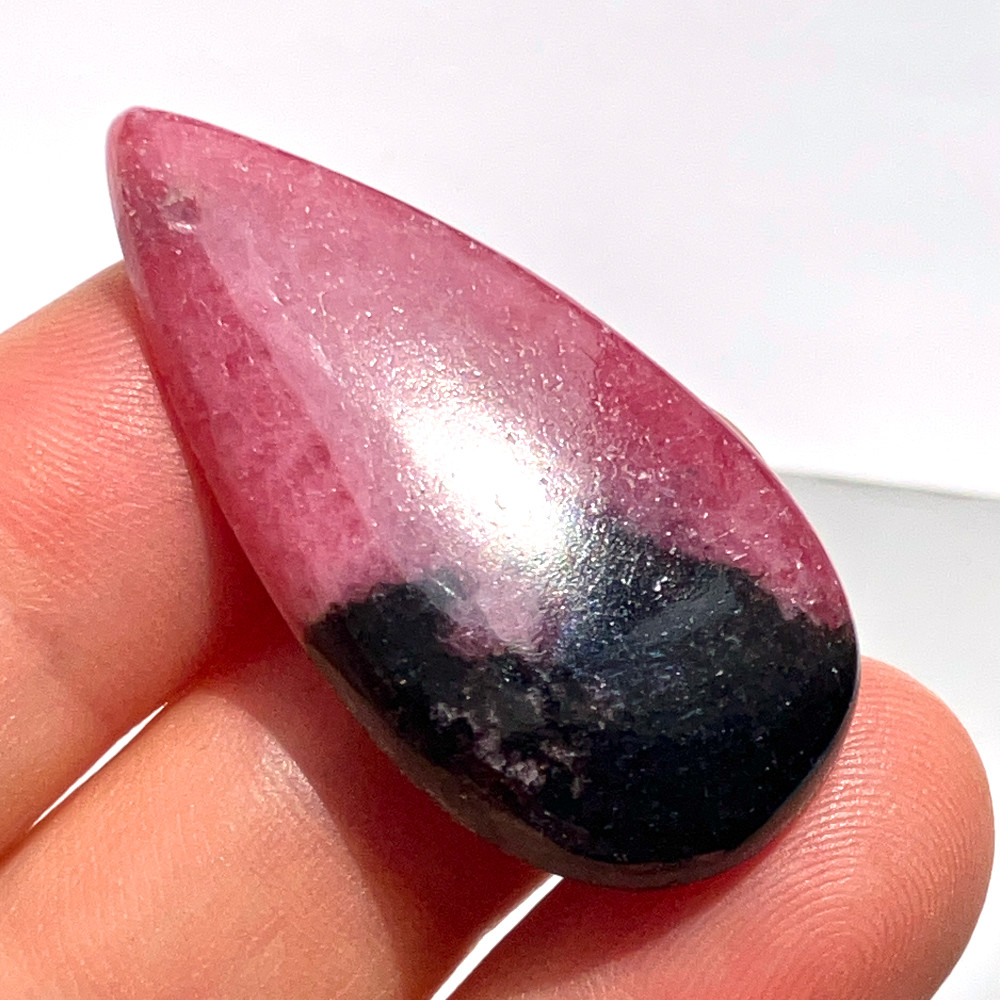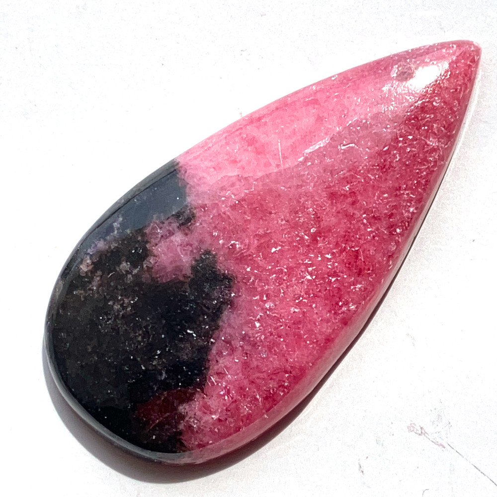 鮮やかなローズピンクに、漆黒のマンガン由来の模様が入り込んだロードナイトのしずく型ルースです。