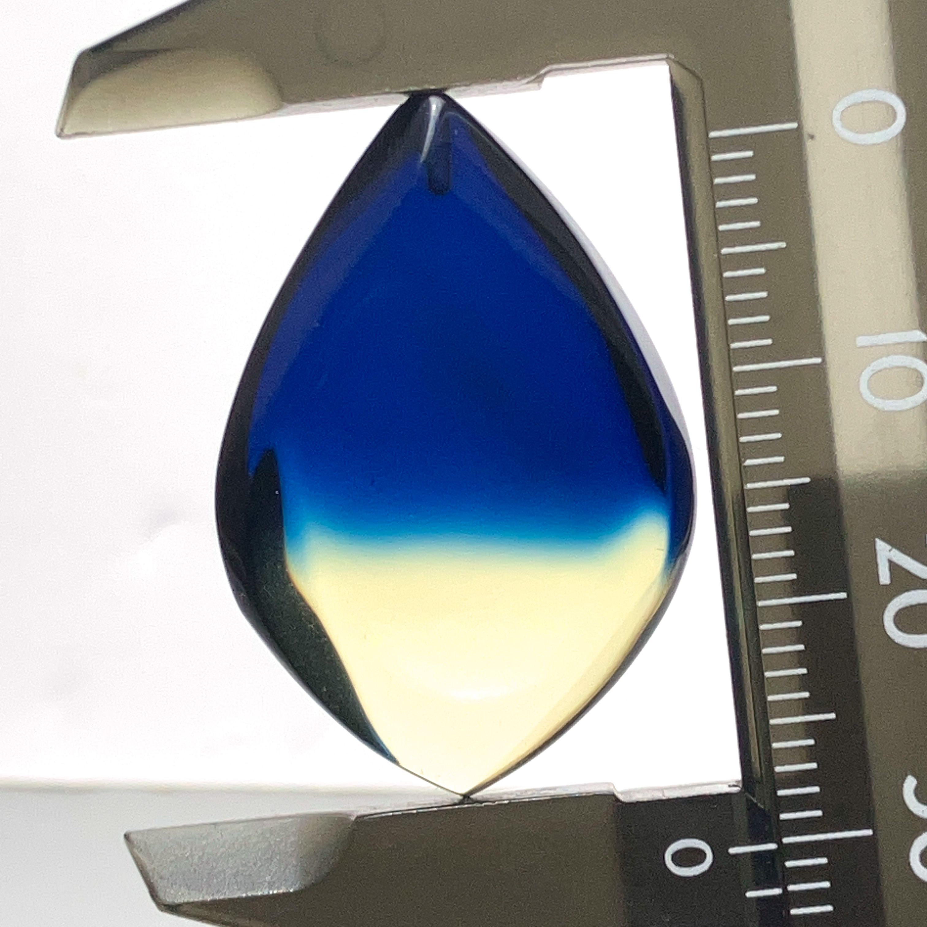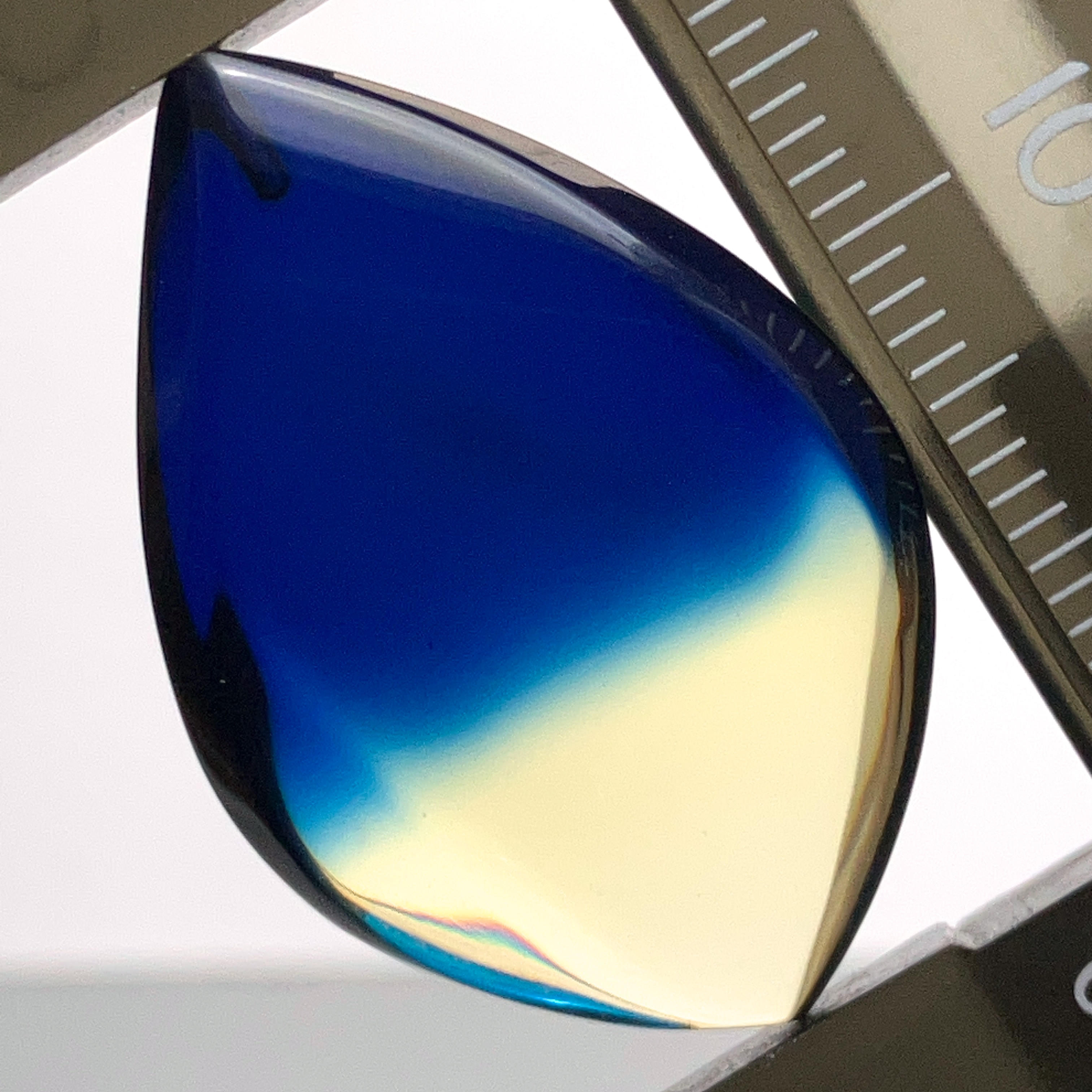 やわらかなレモン色から深いサファイアブルーへと溶け込むグラデーションが、透明感の中で美しく映えるルースです。