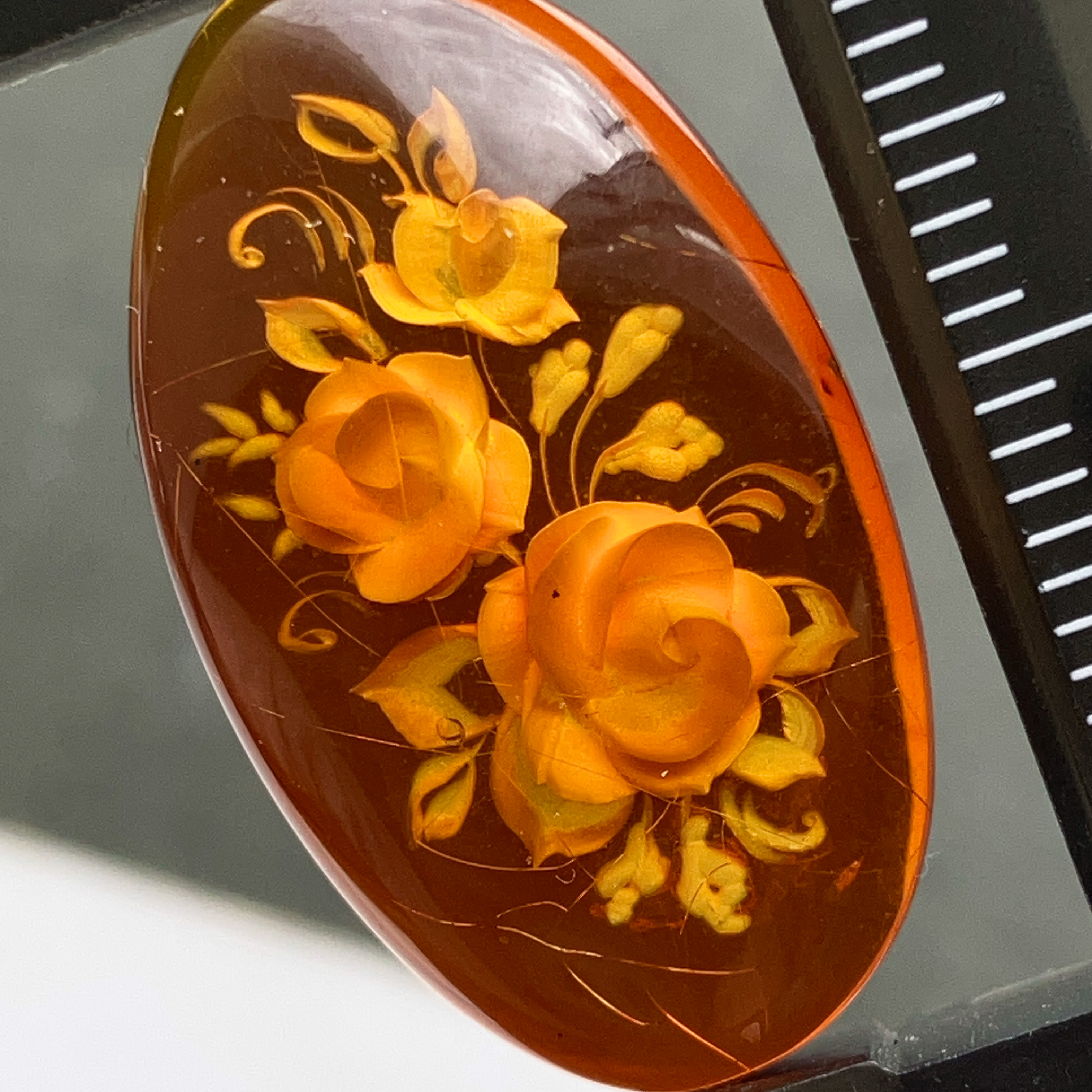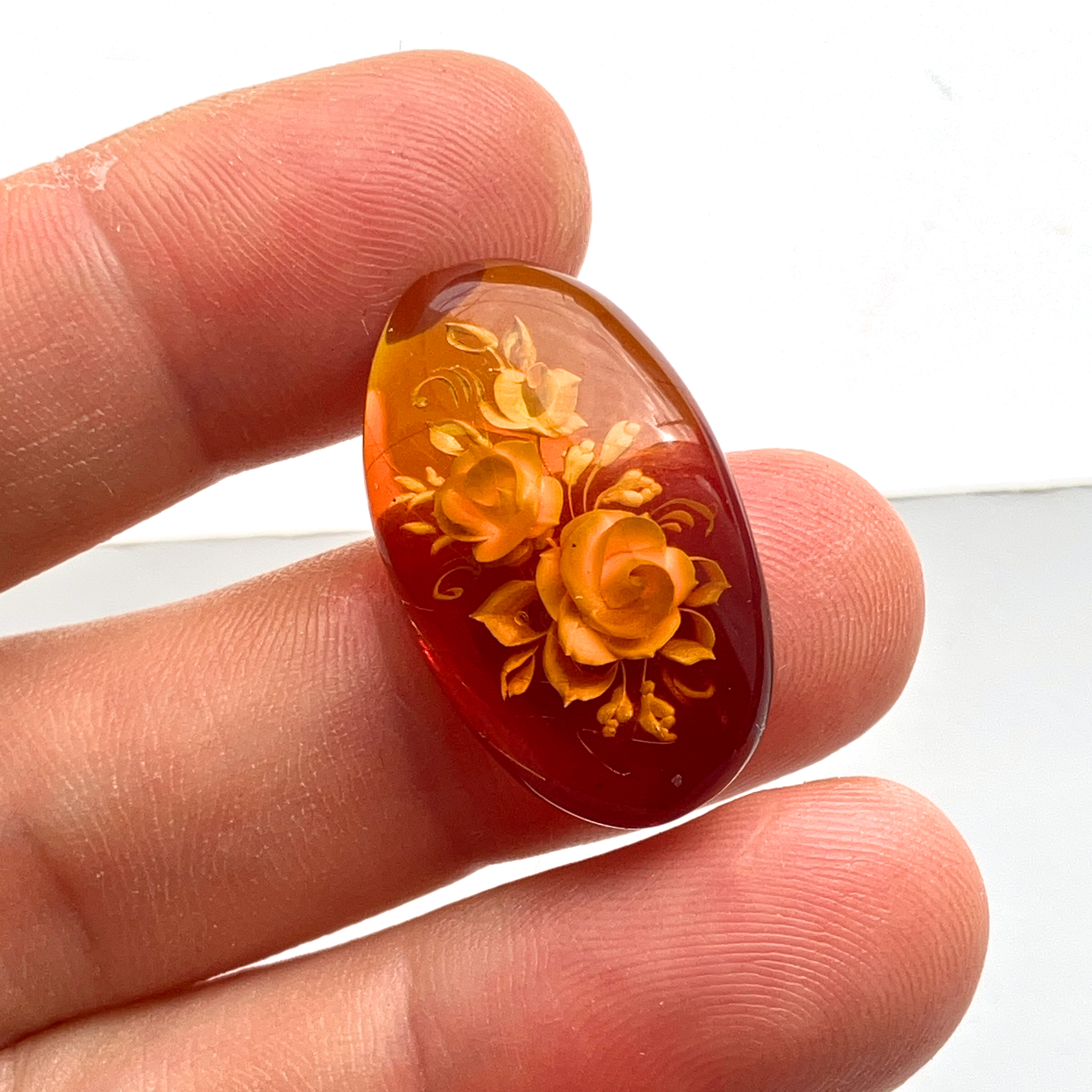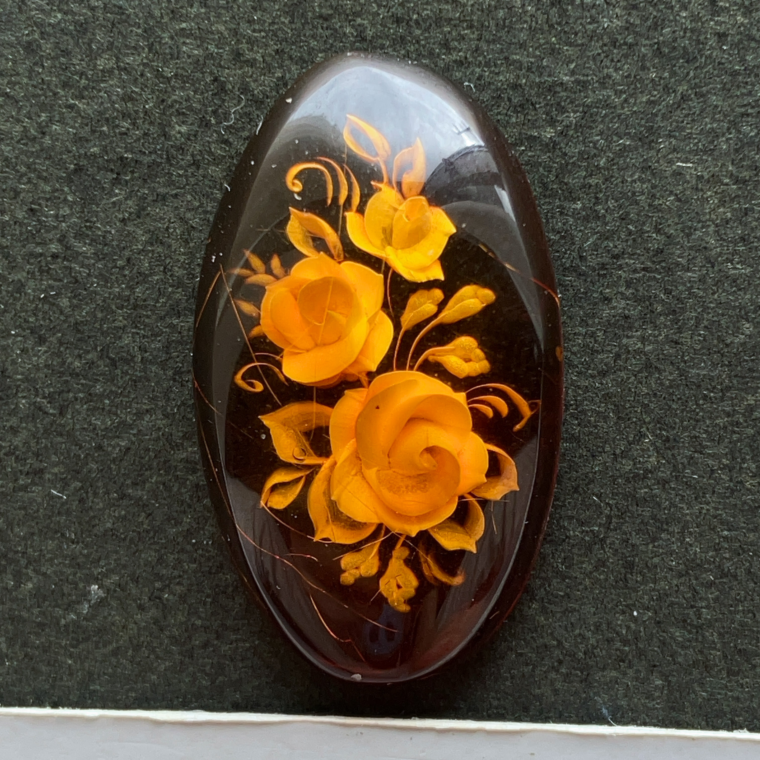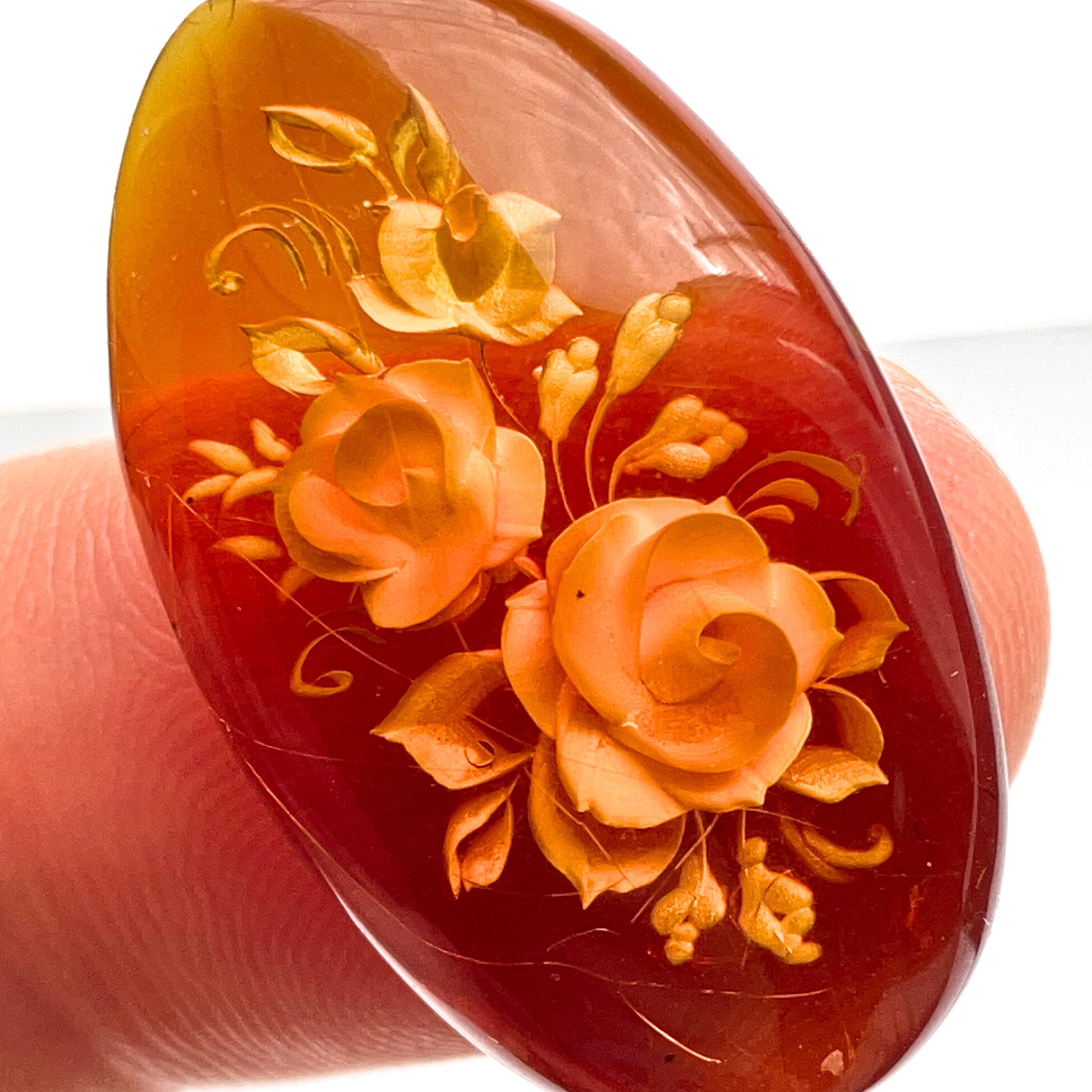 ふっくらとしたオーバルカボションの内部に、二輪のバラが立体的に咲き、花弁や蕾の細工まで繊細に表現されています。