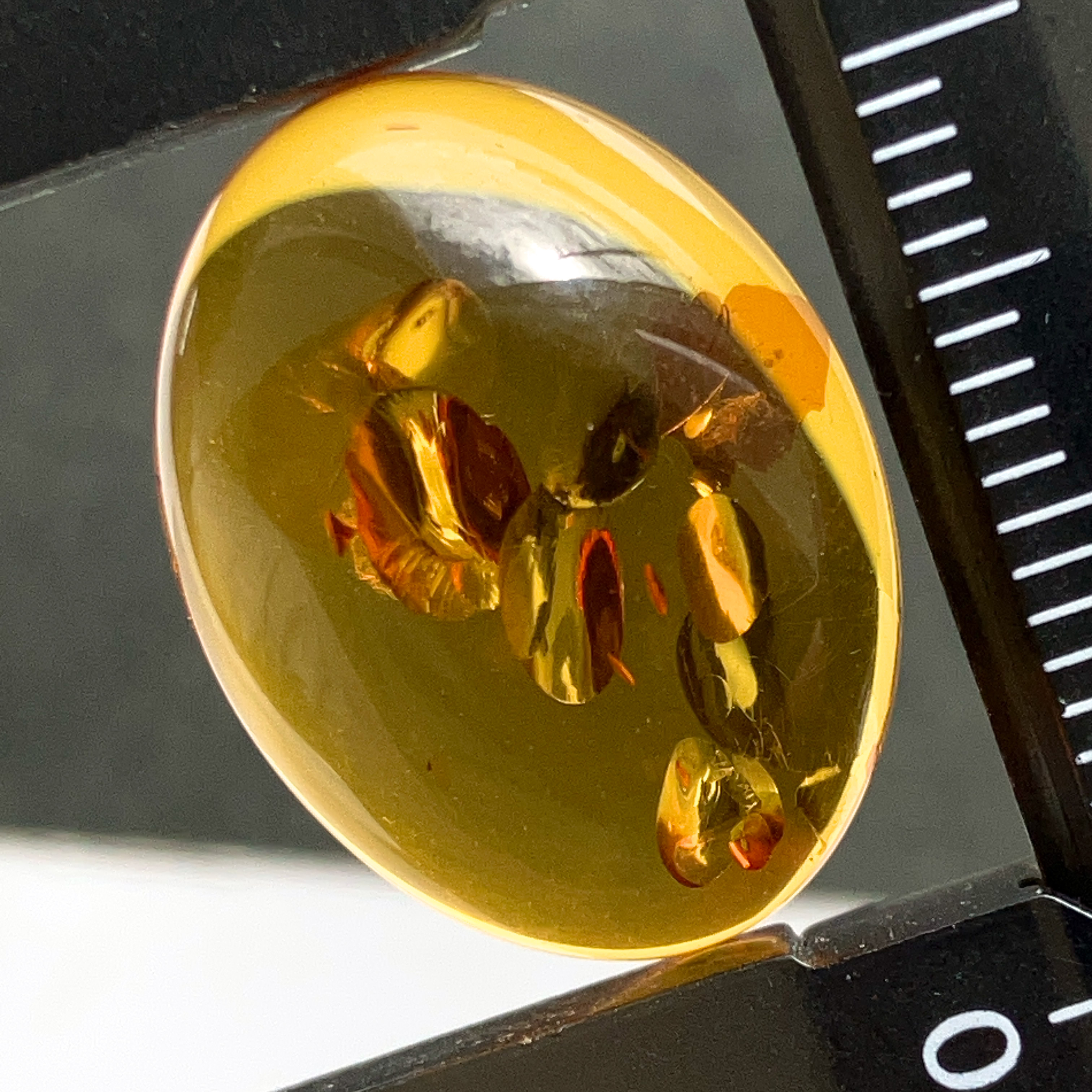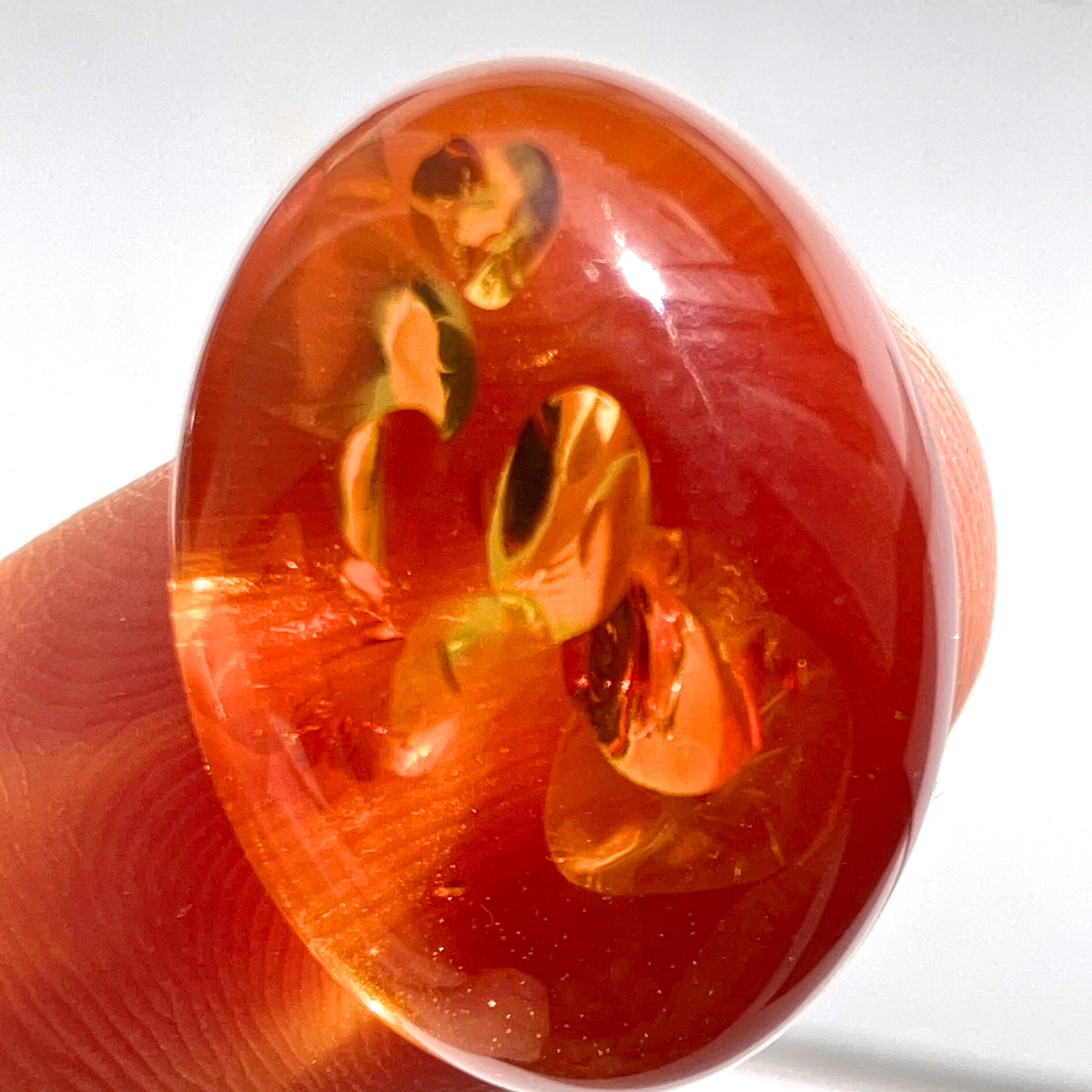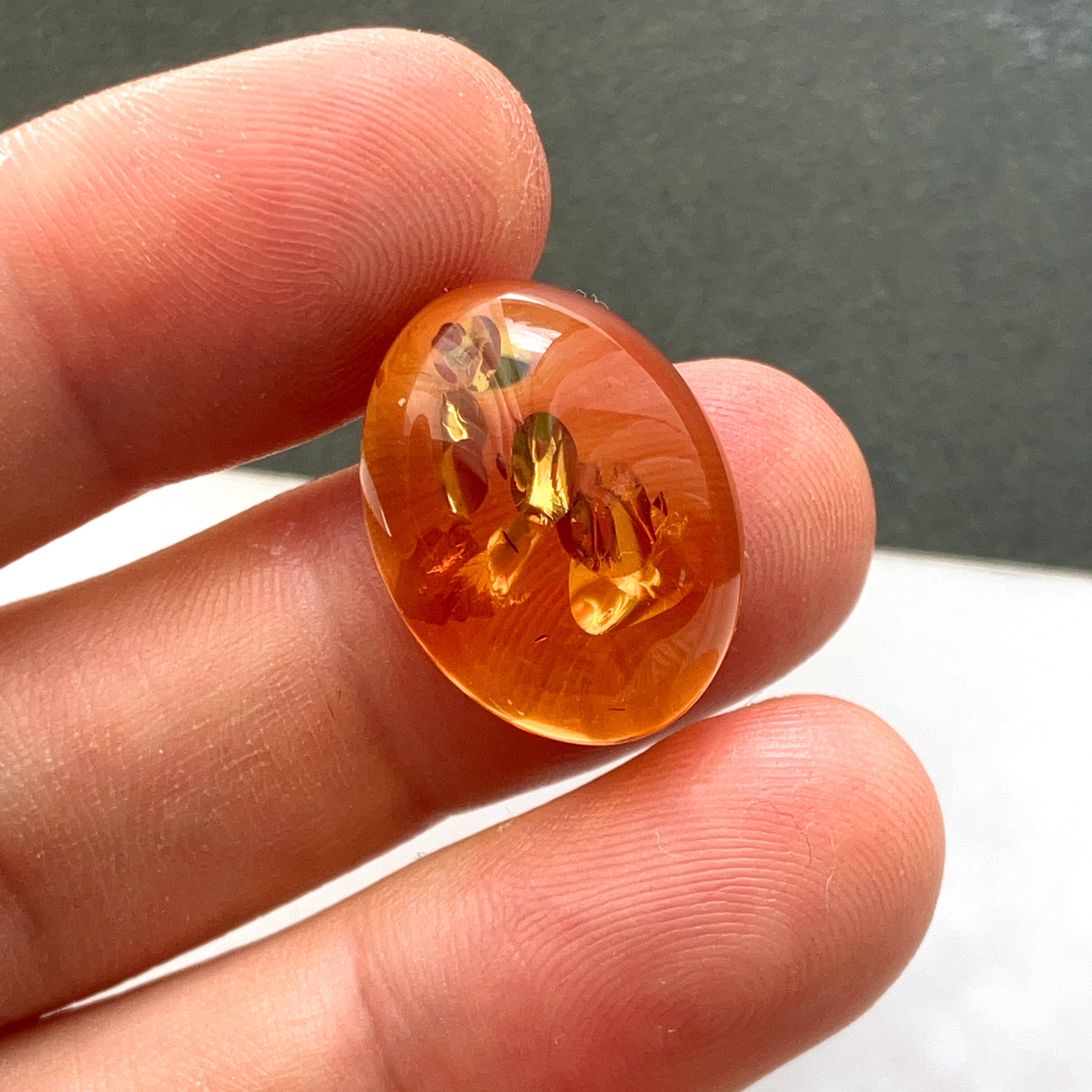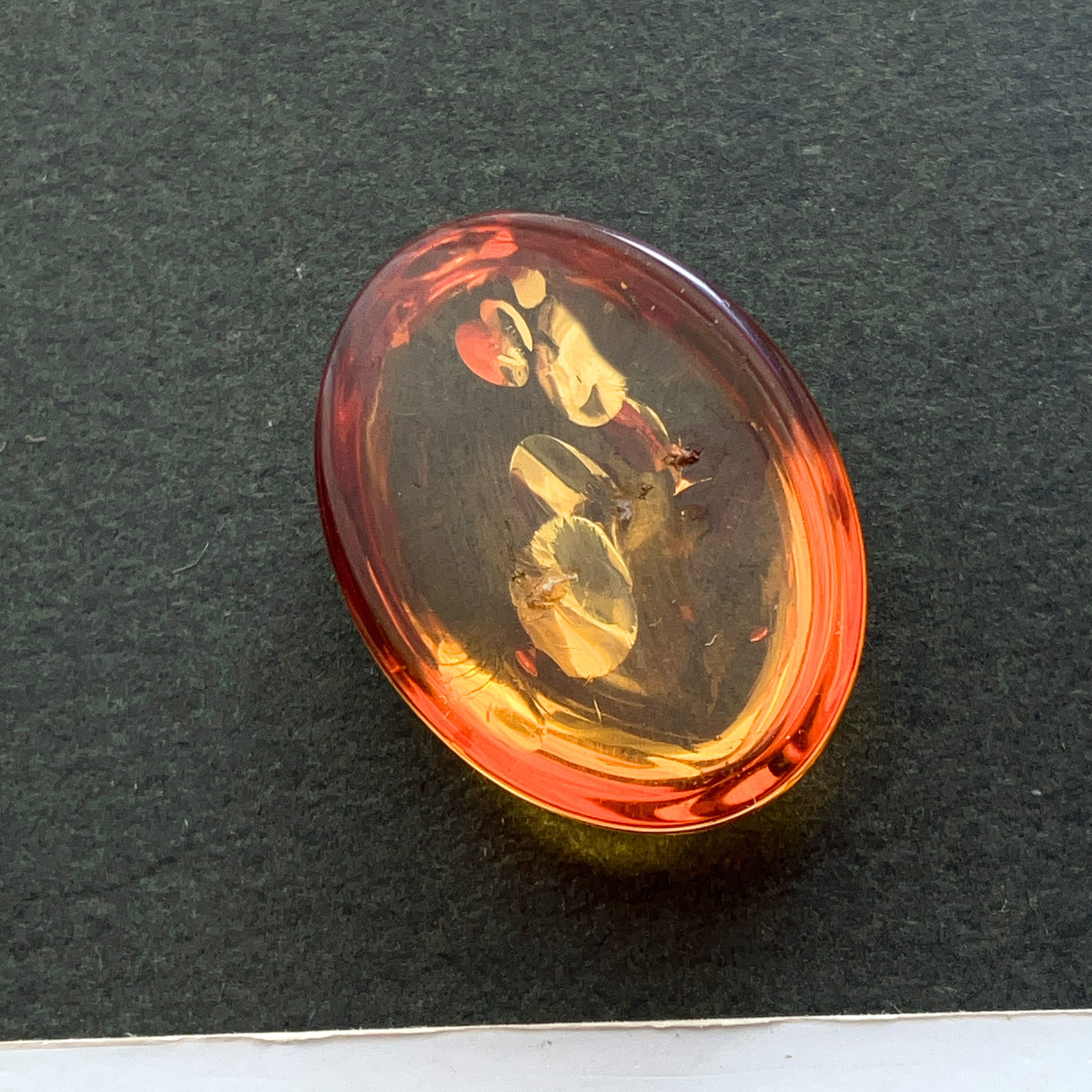内部のサンスパングルが花びらのように反射し、艶やかな立体感を生み出している、バルティックアンバーの楕円形ルースです。