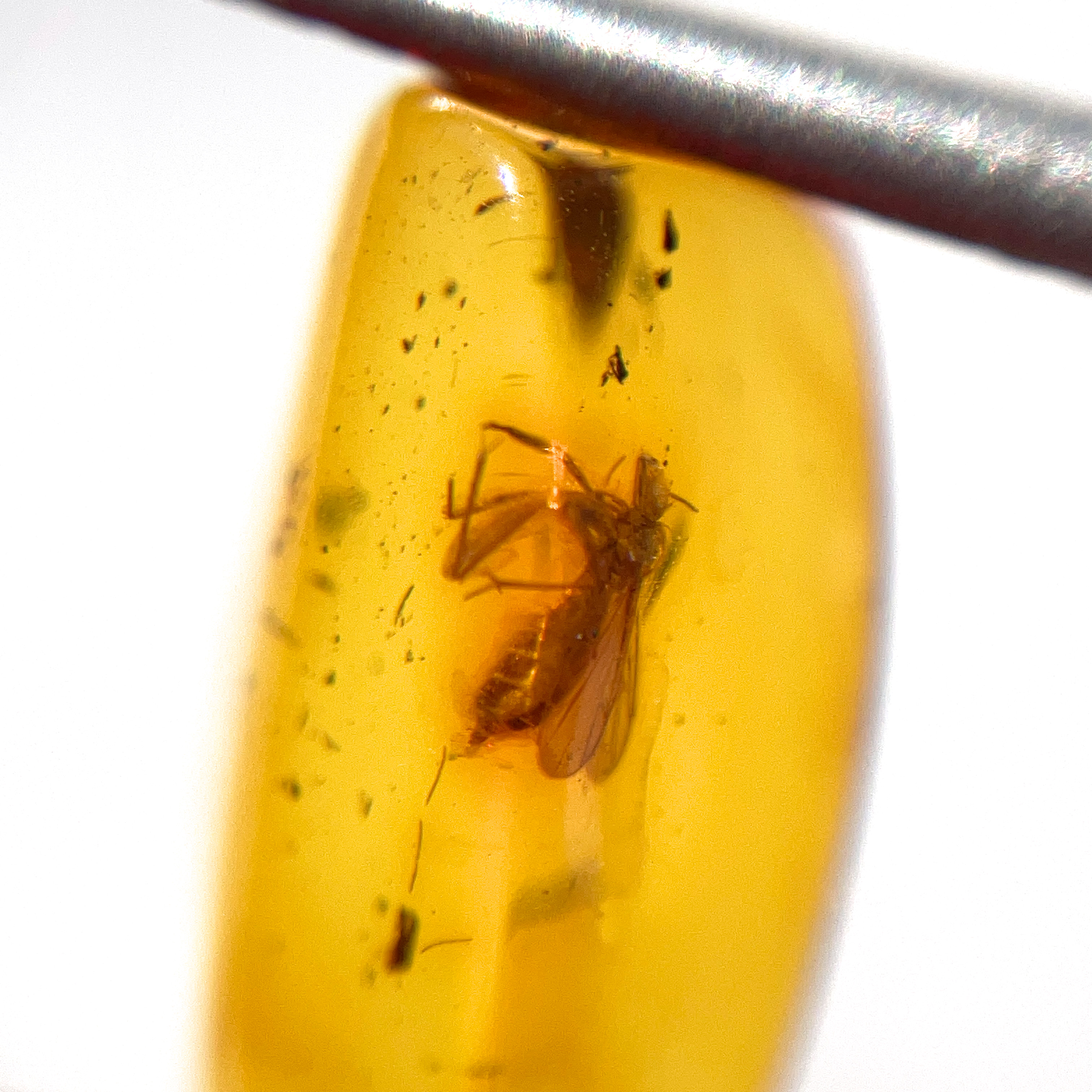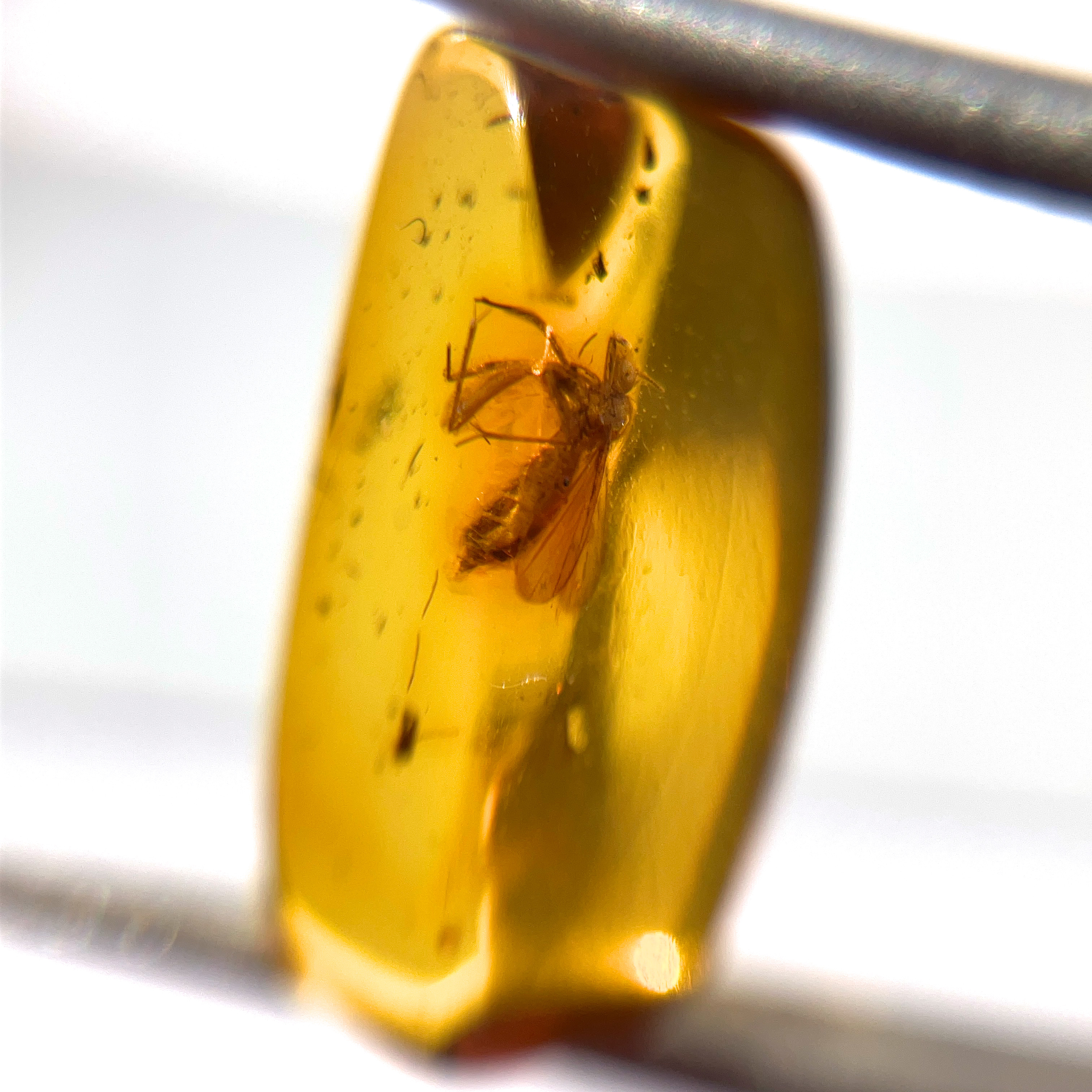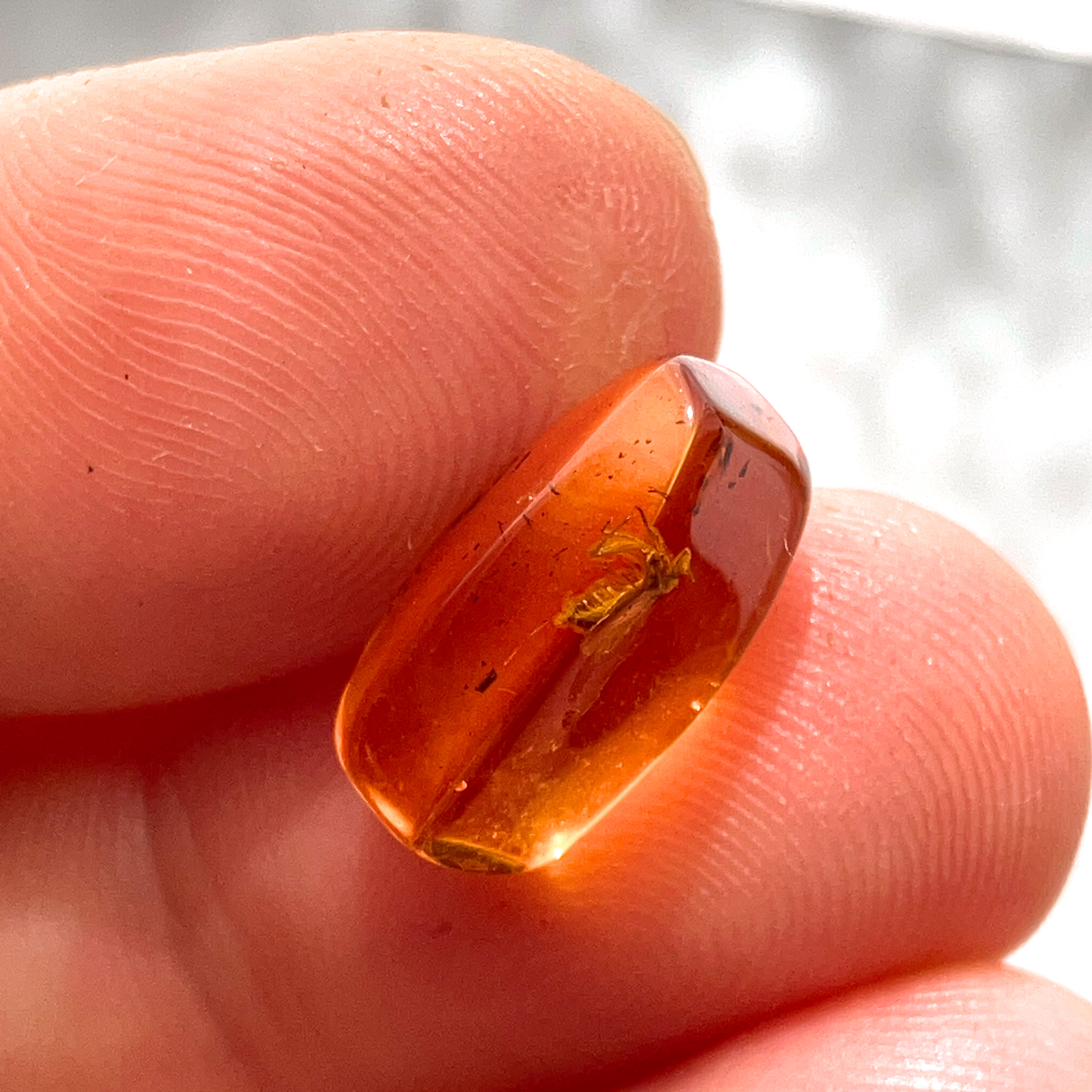 内部に小さな羽をもつ昆虫の姿が閉じ込められた、透明感が美しい琥珀の小粒ルース。