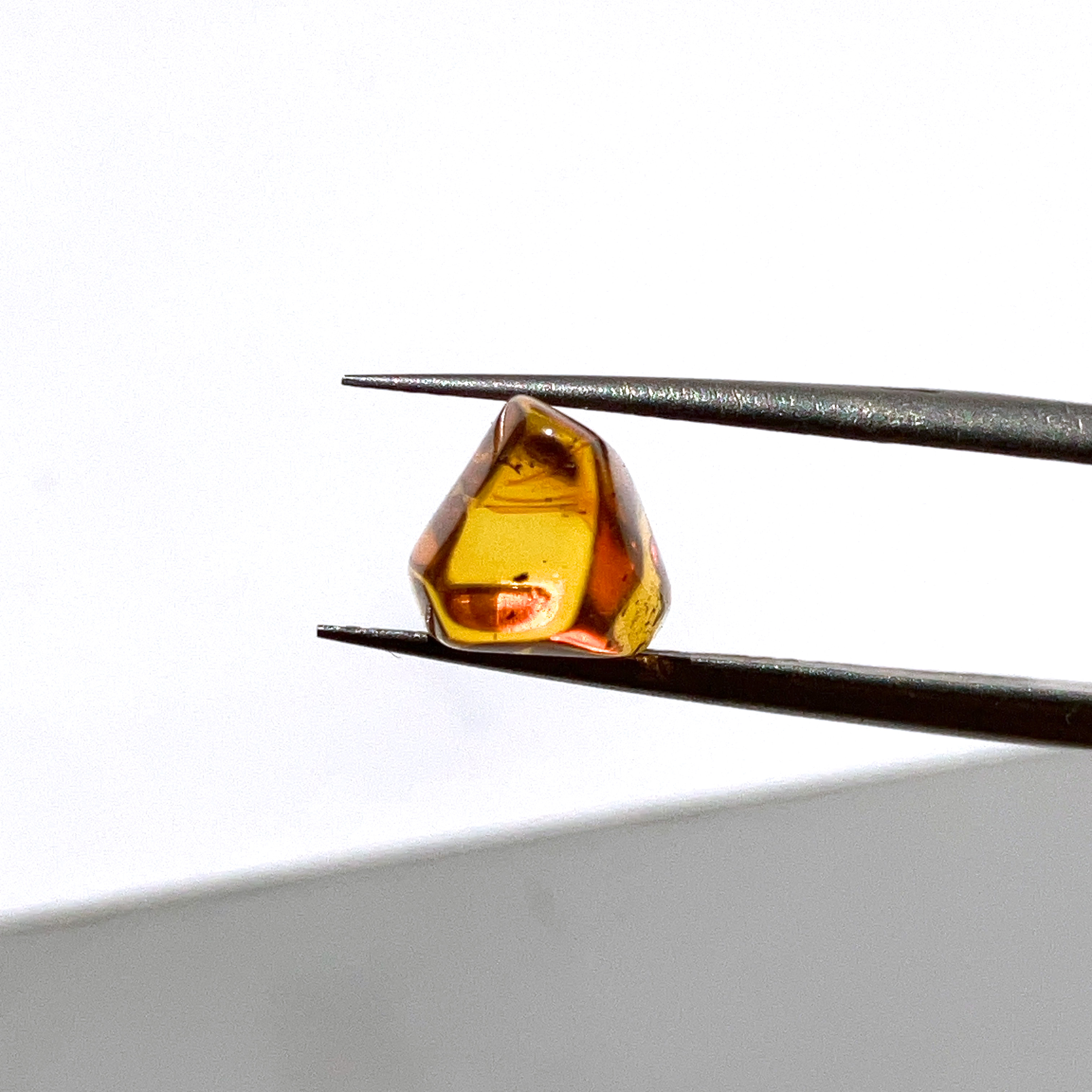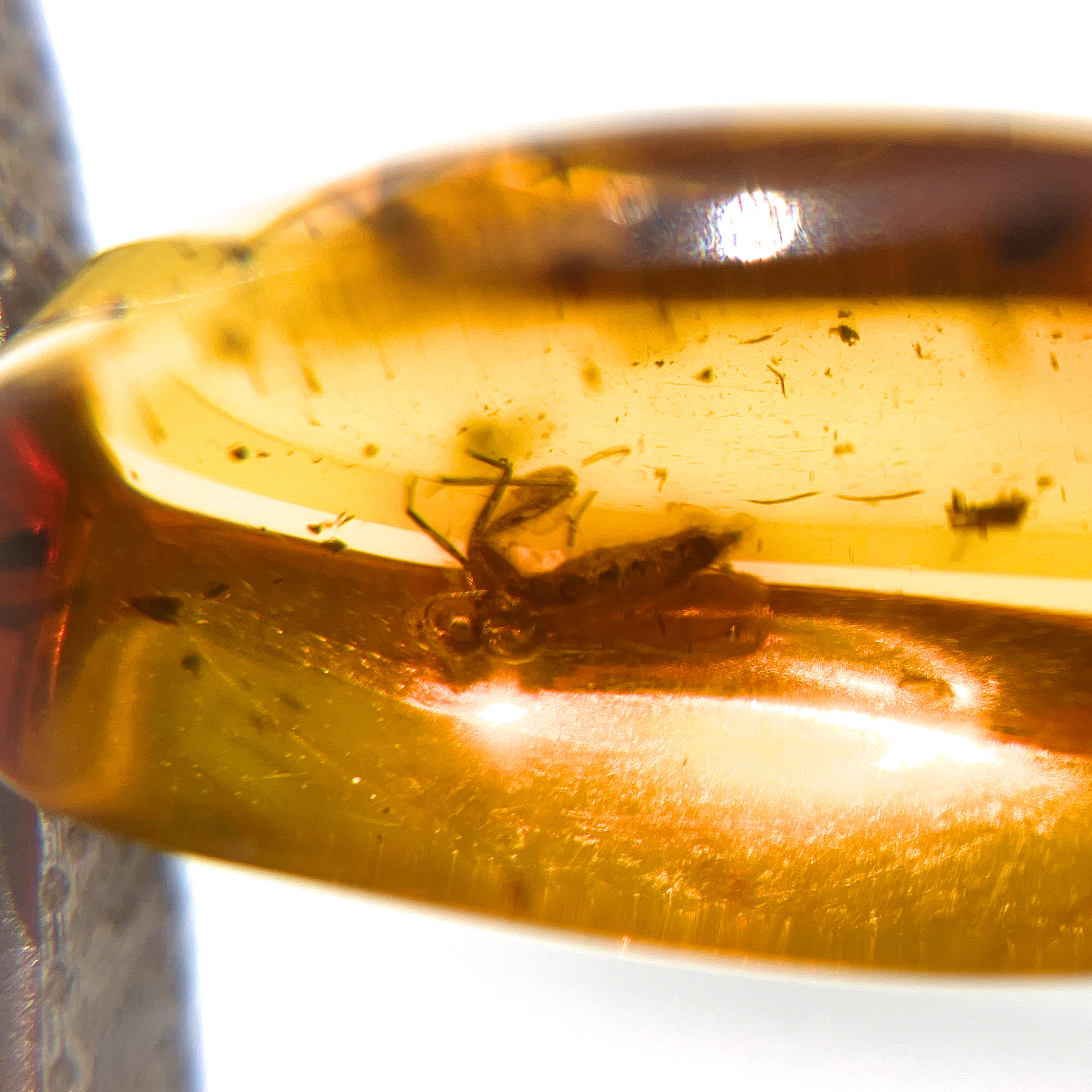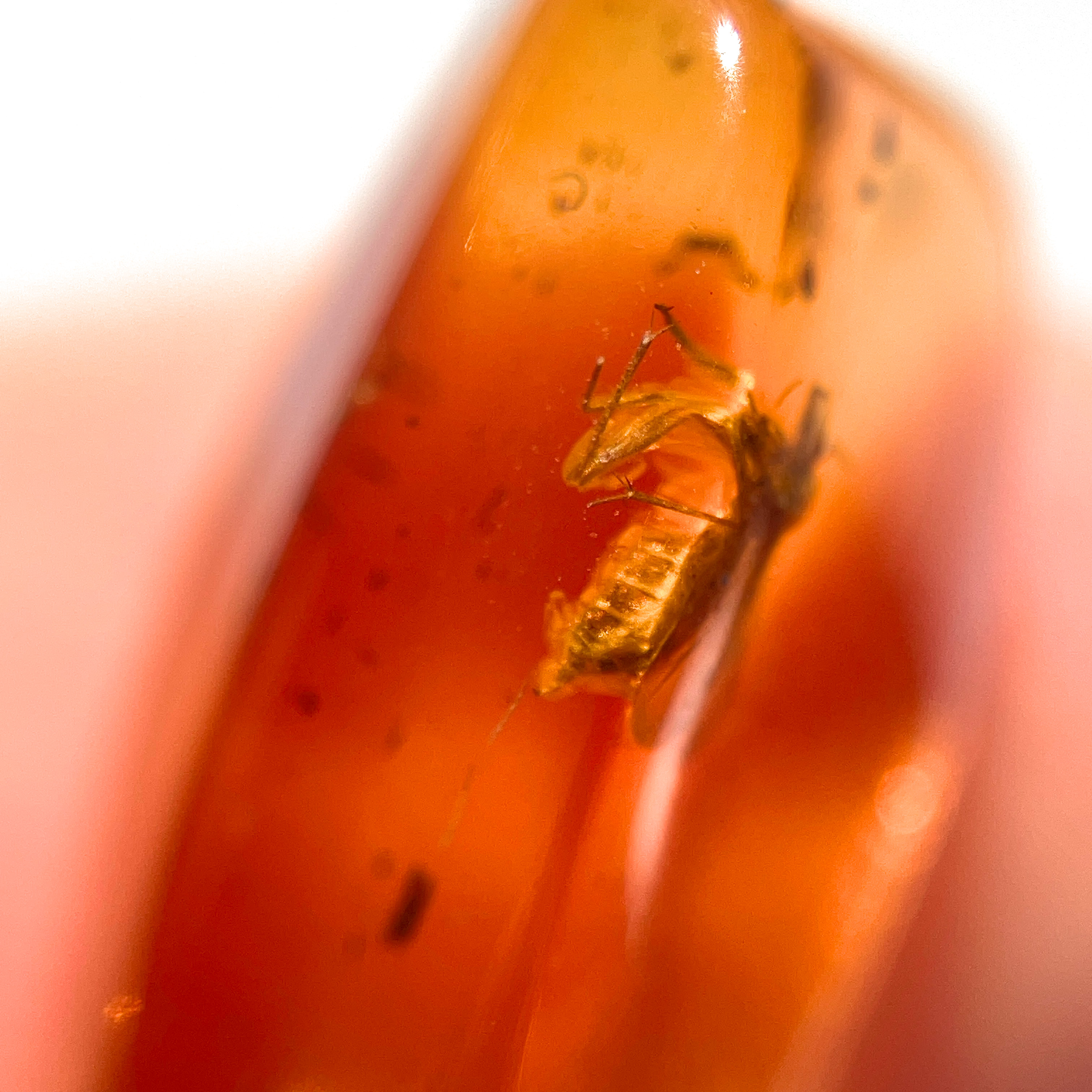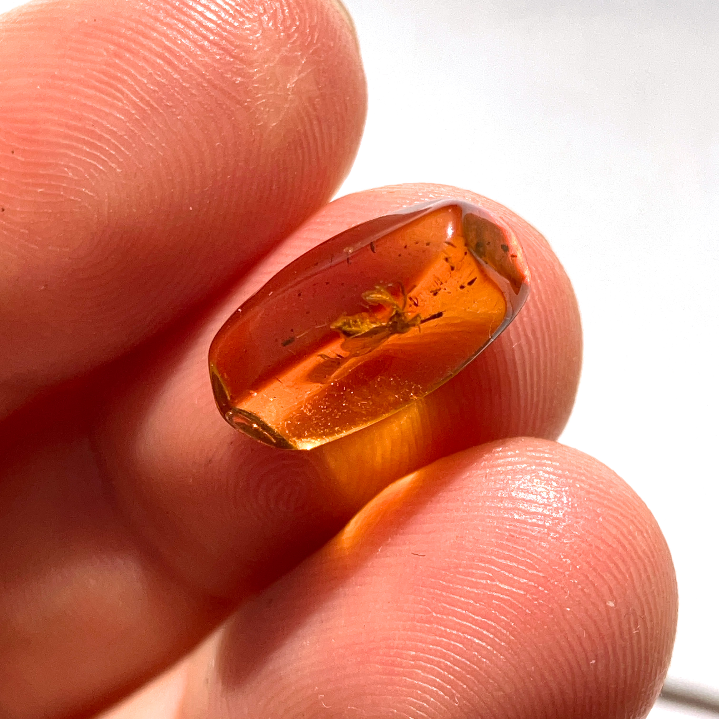 内部に小さな羽をもつ昆虫の姿が閉じ込められた、透明感が美しい琥珀の小粒ルース。