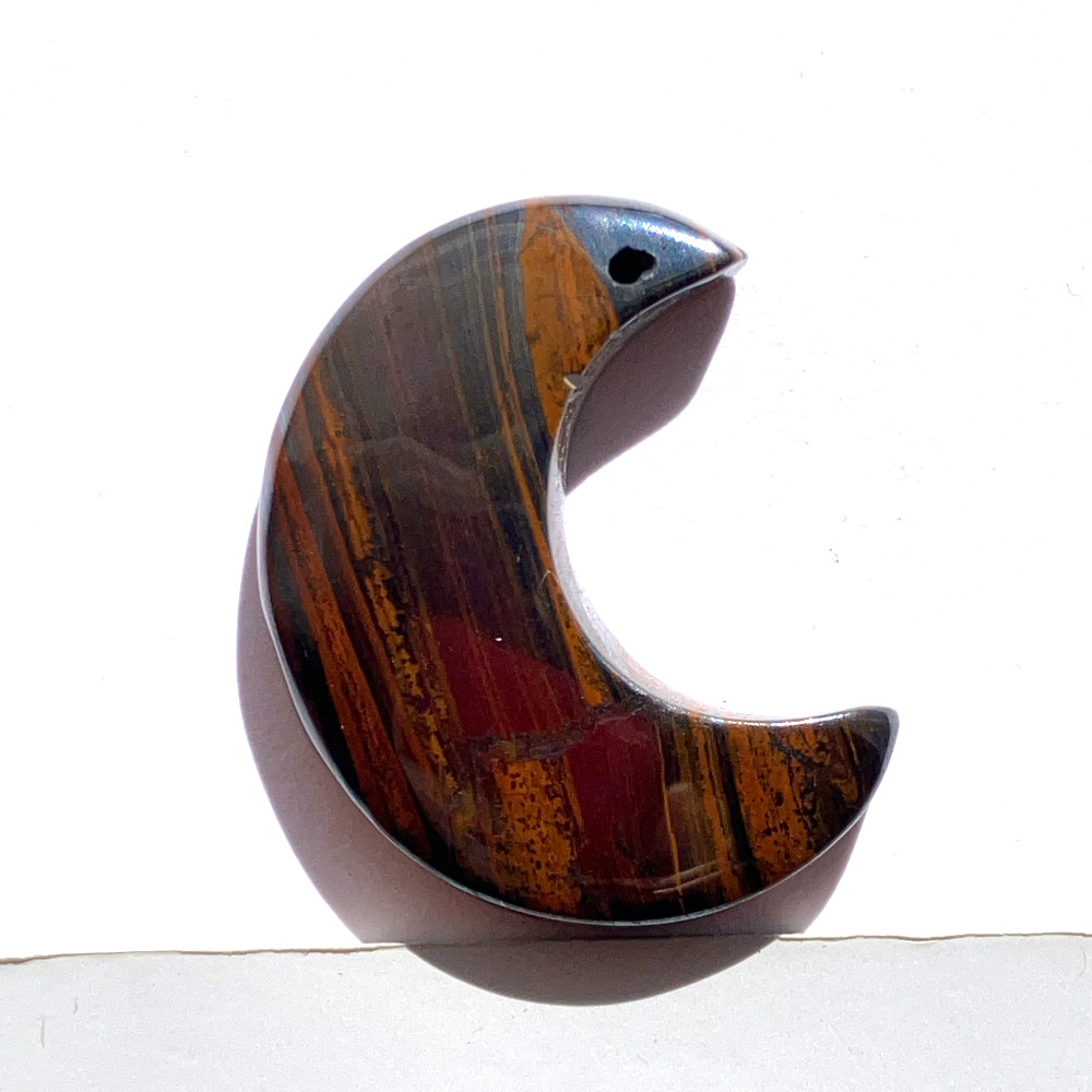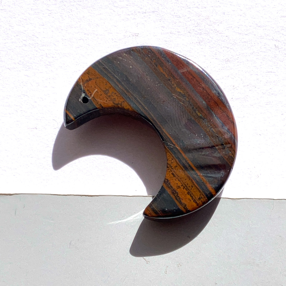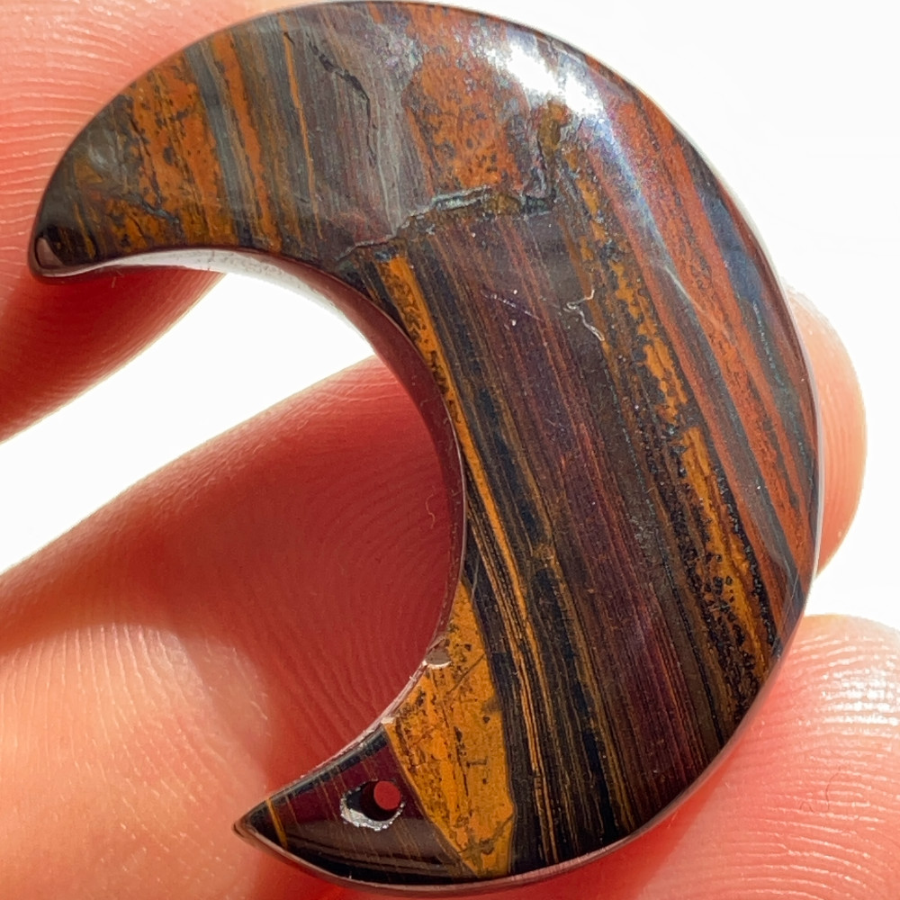 赤褐色、黒褐色、金属的なグレーが層状に重なり合い、アイアンタイガー特有の縞模様がはっきりと現れた月形ルースです。