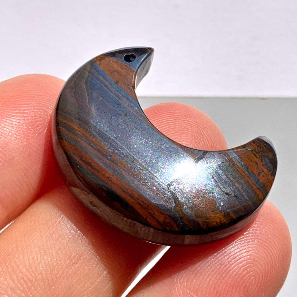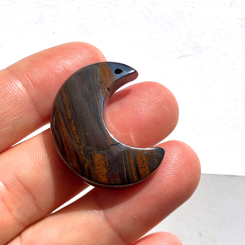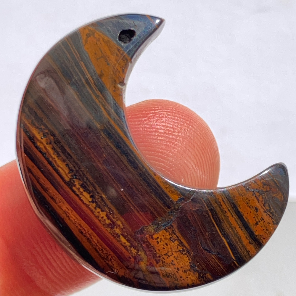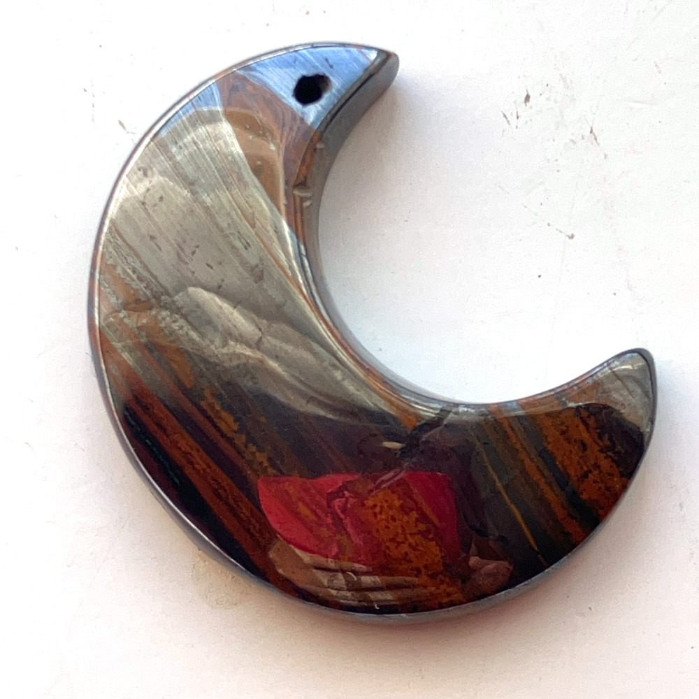 赤褐色、黒褐色、金属的なグレーが層状に重なり合い、アイアンタイガー特有の縞模様がはっきりと現れた月形ルースです。