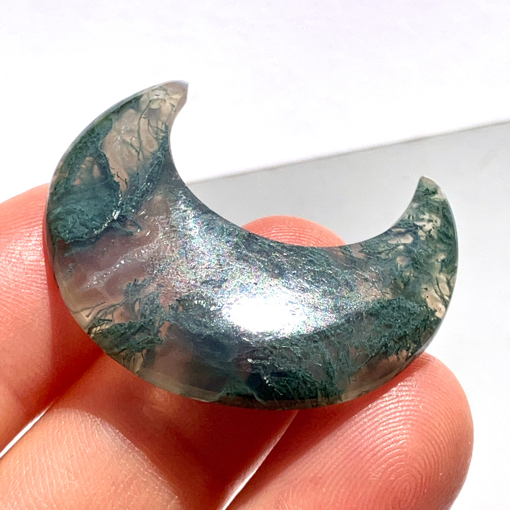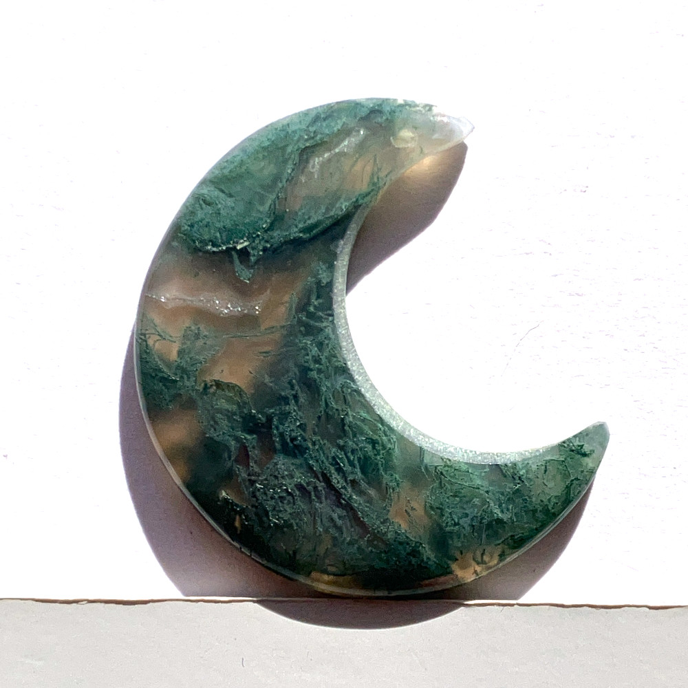 半透明のベースの中に、苔やシダを思わせる苔状インクルージョンが広がる月形ルースです。