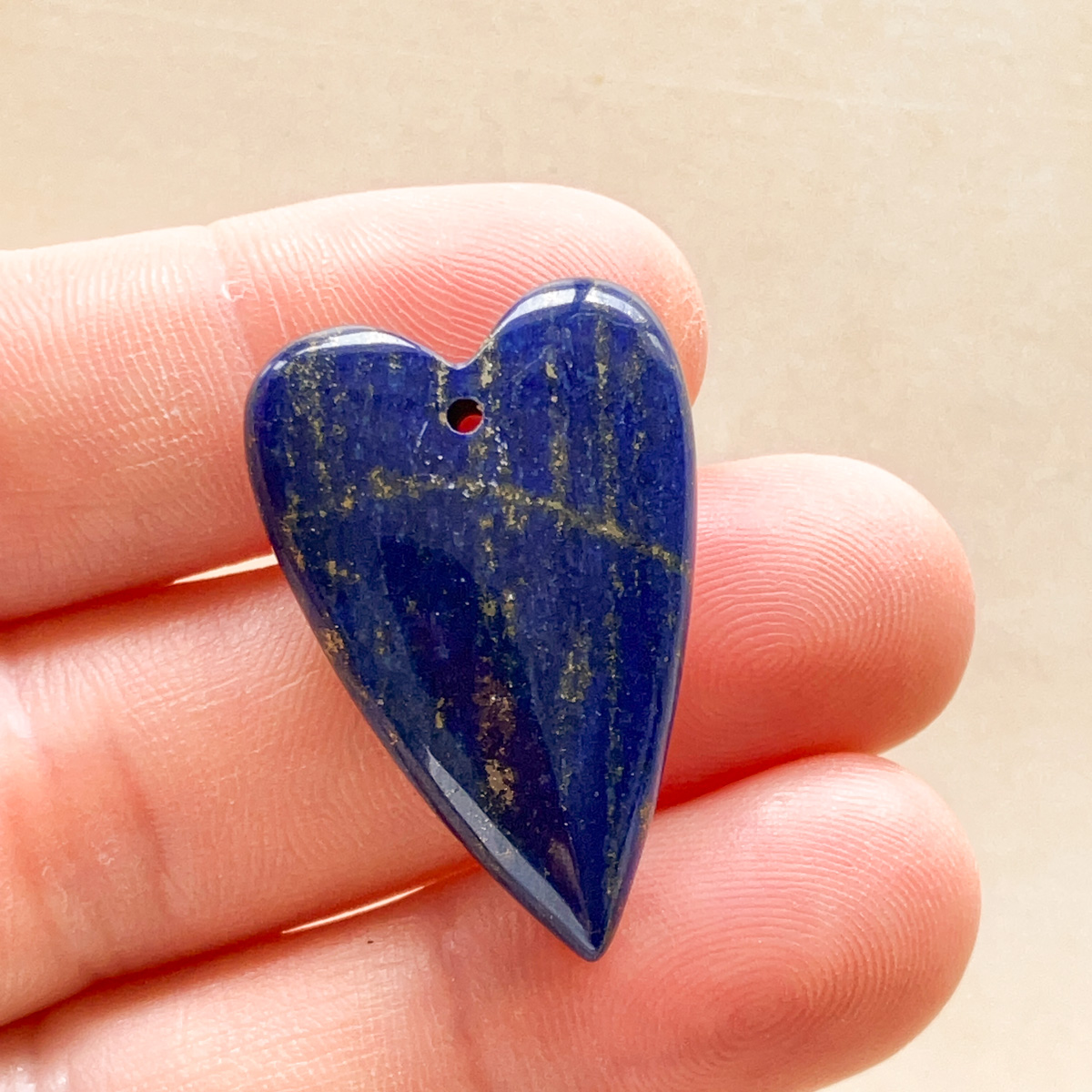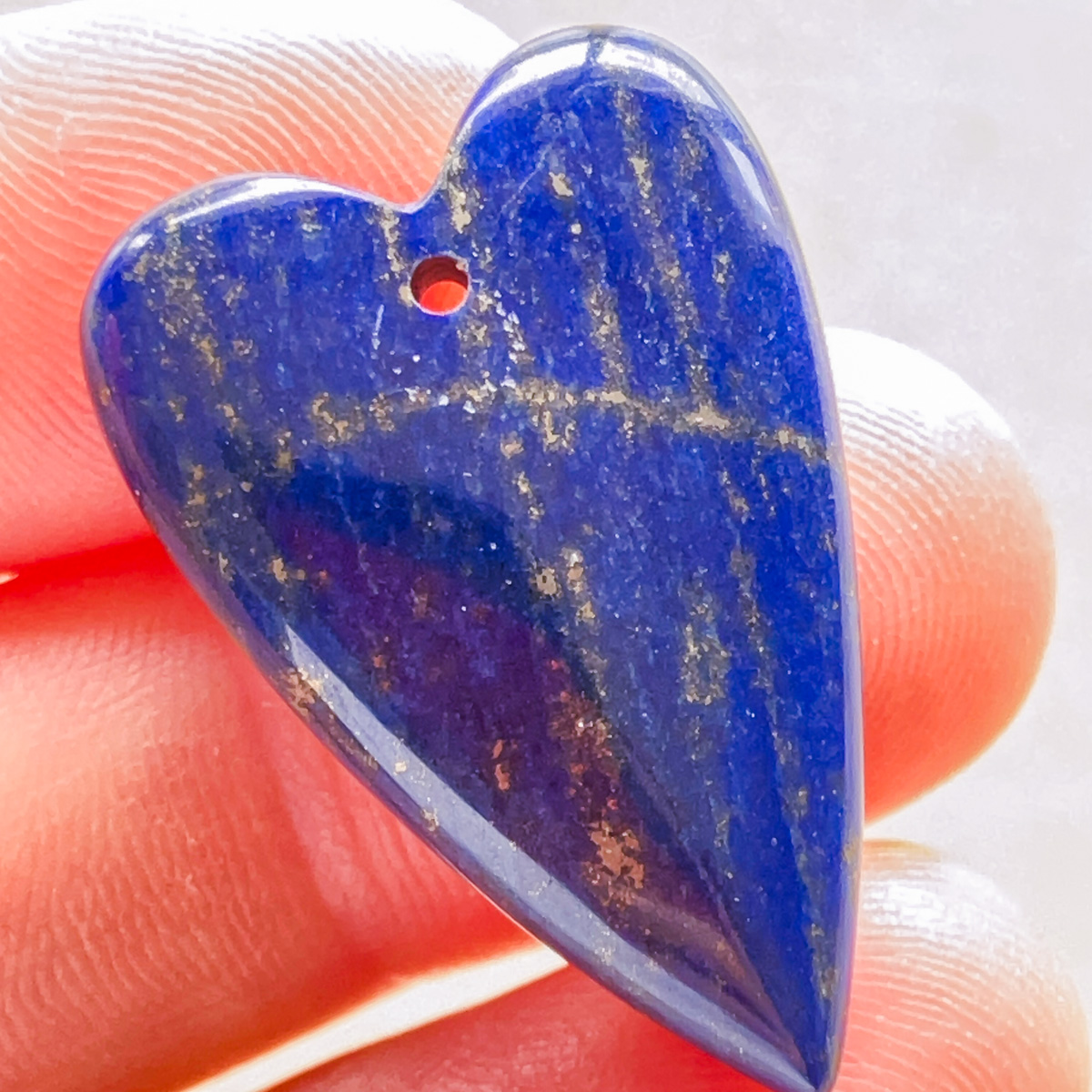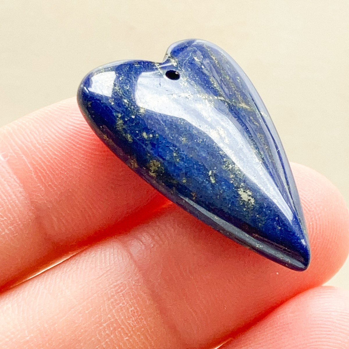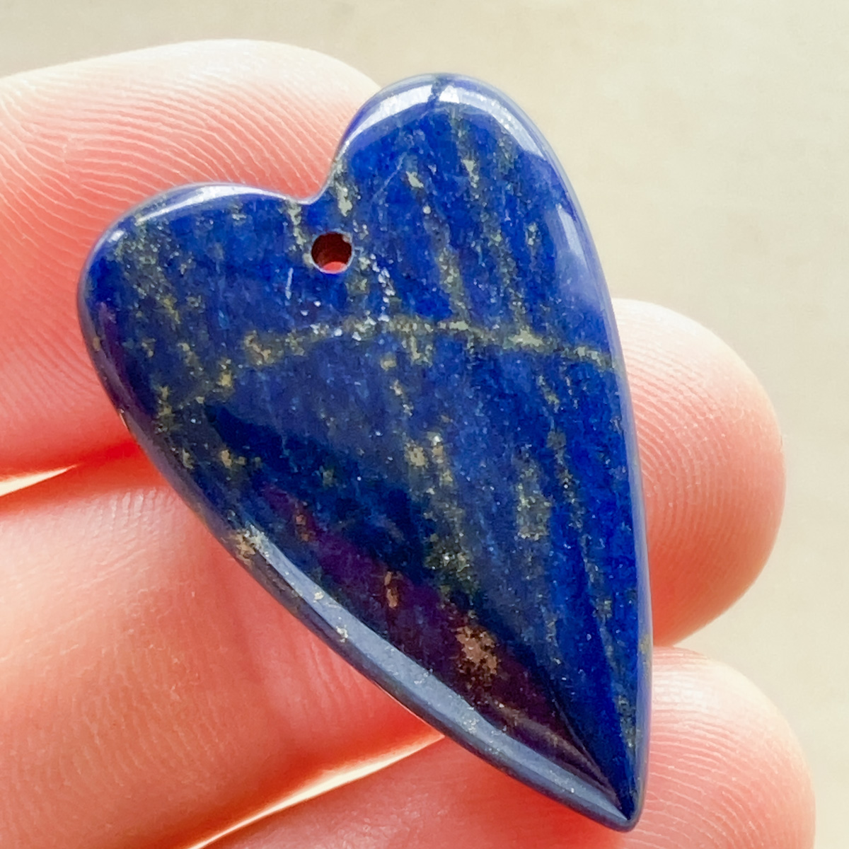 深みのある青の中に、パイライトが筋のように流れるように現れた、印象的な表情のラピスラズリです。