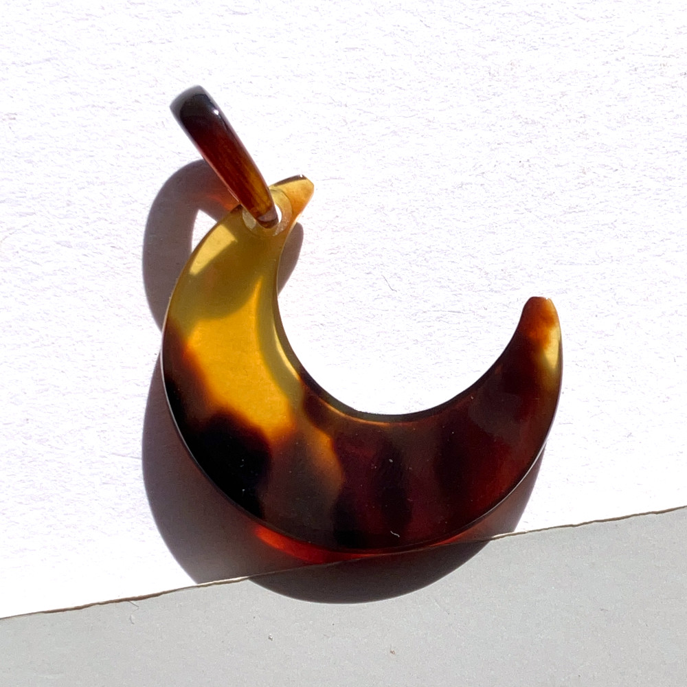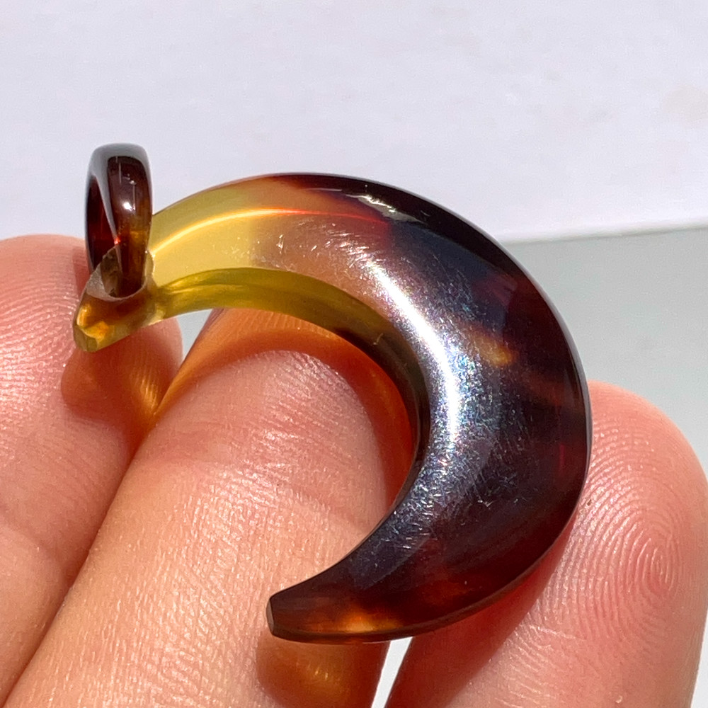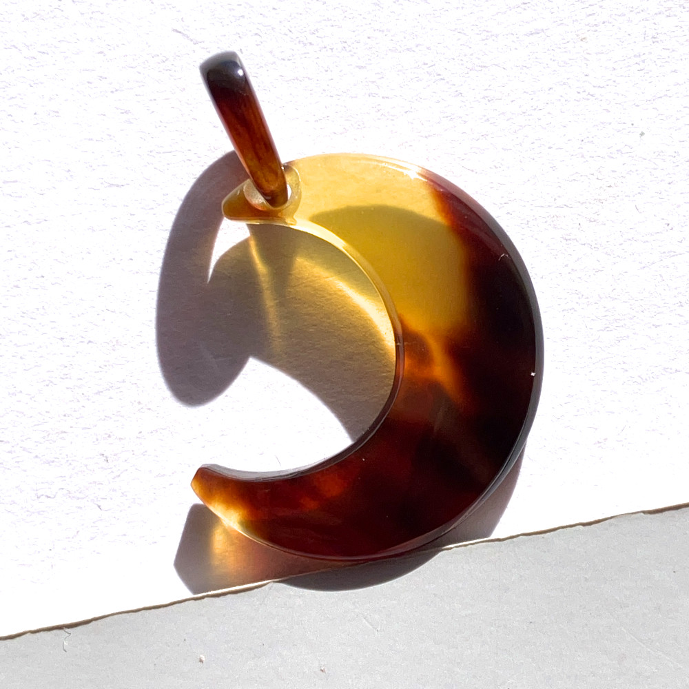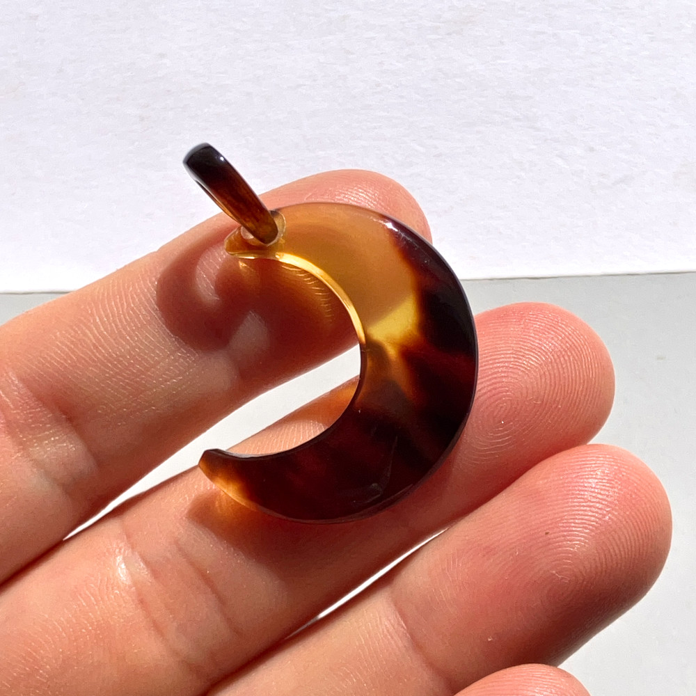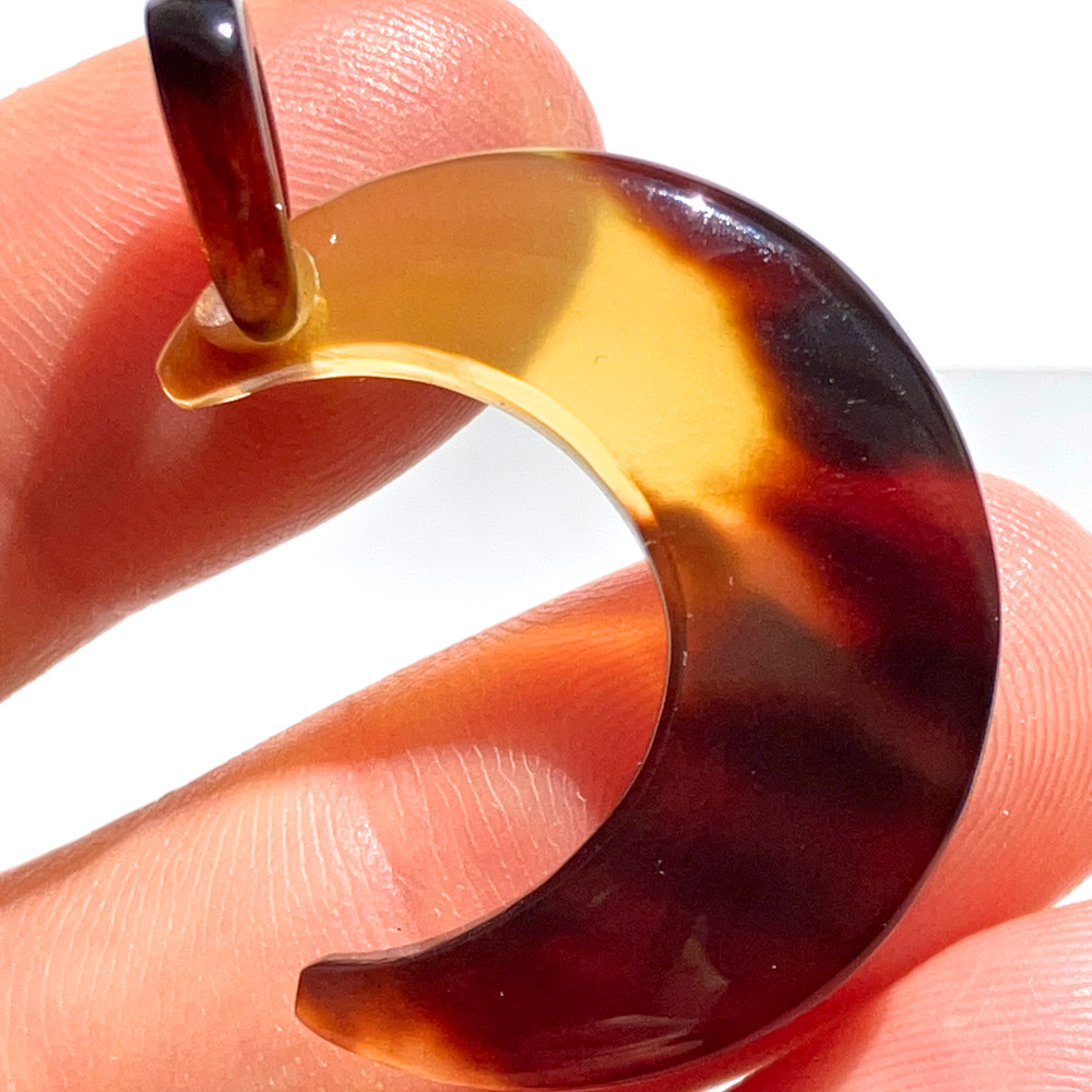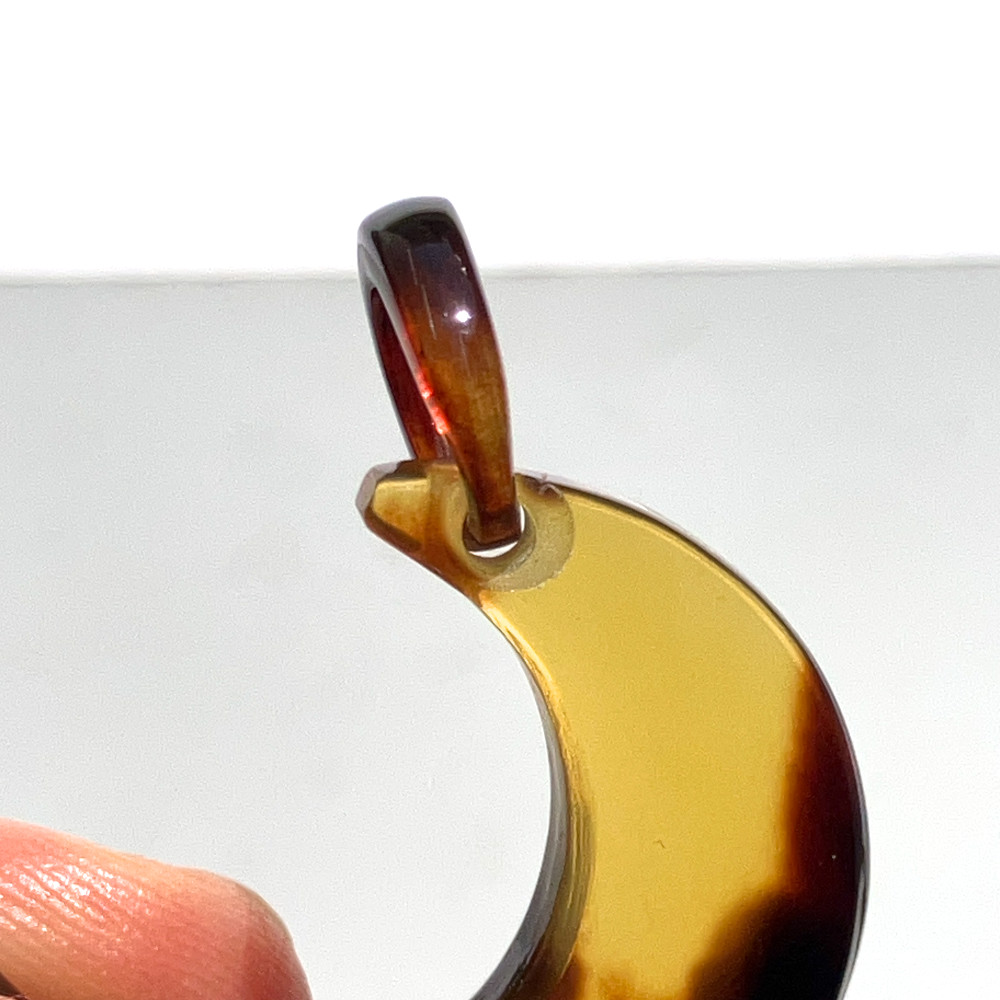 明るい飴色を基調に、赤褐色の斑がやわらかく溶け合う三日月シェイプのべっ甲です。