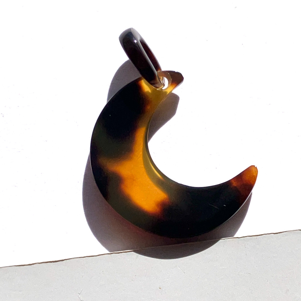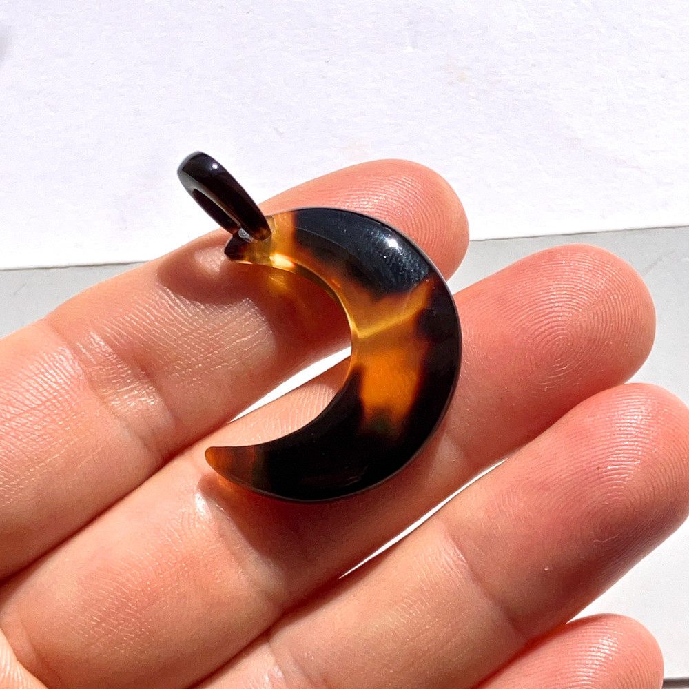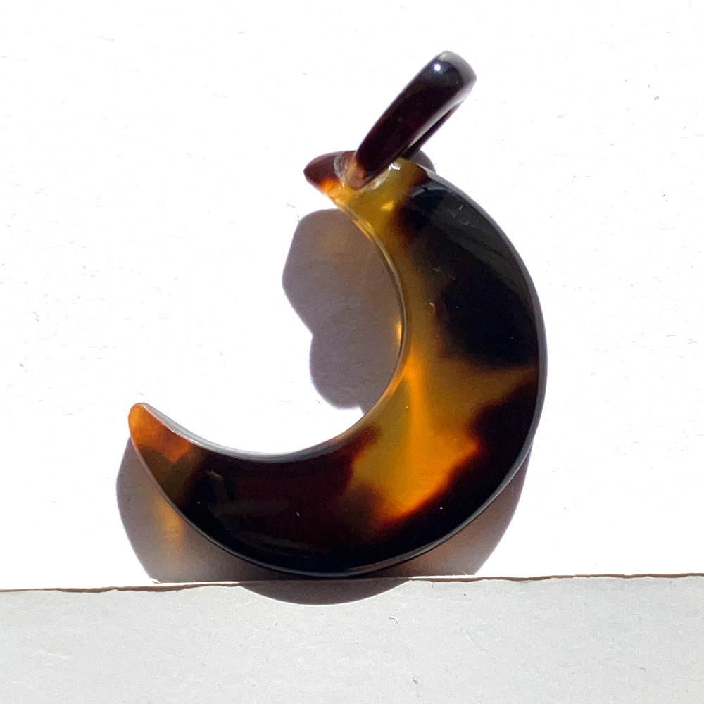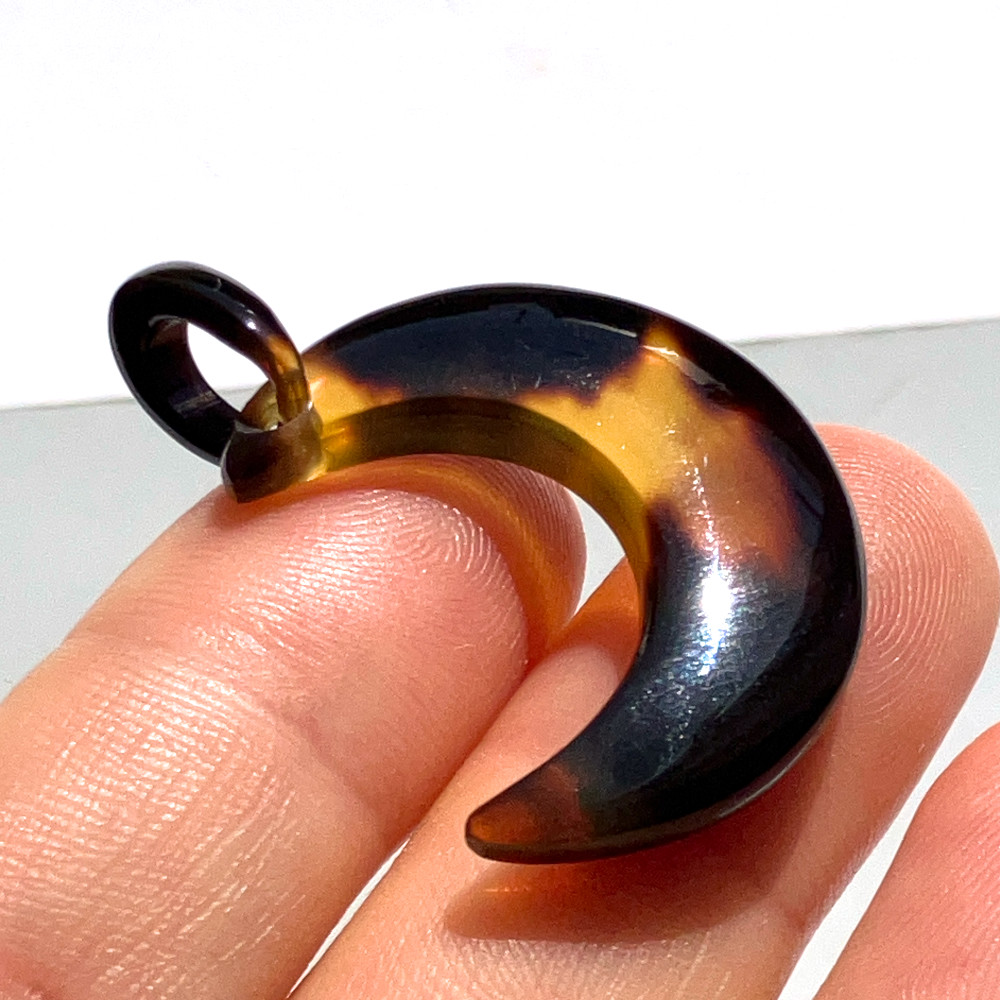 艶のある黒褐色をベースに、中央へ向かって明るい飴色が広がる三日月シェイプのべっ甲です。