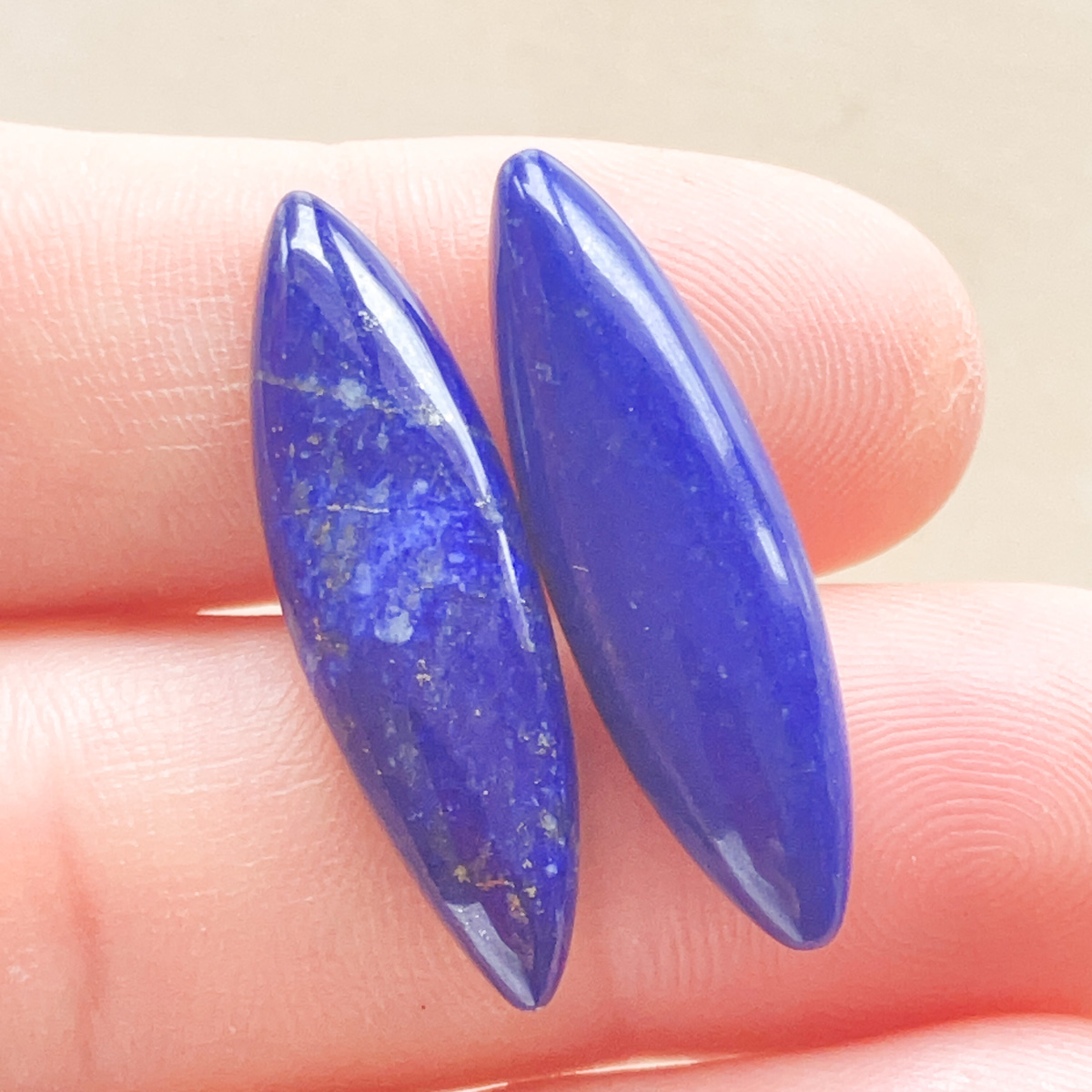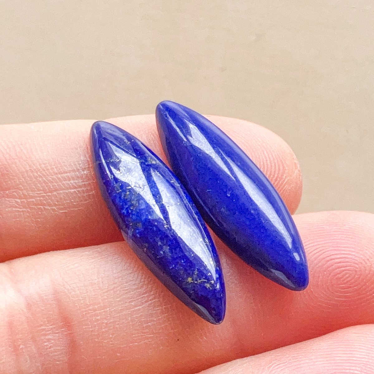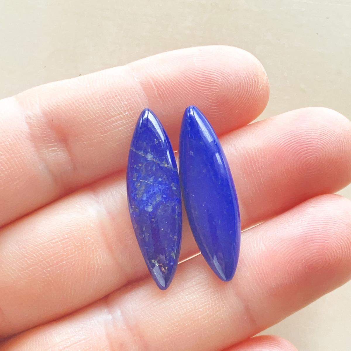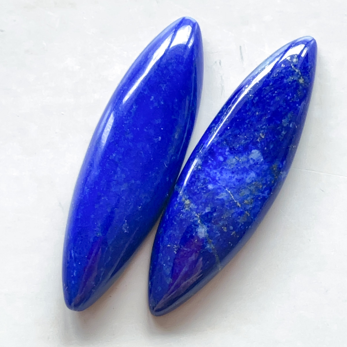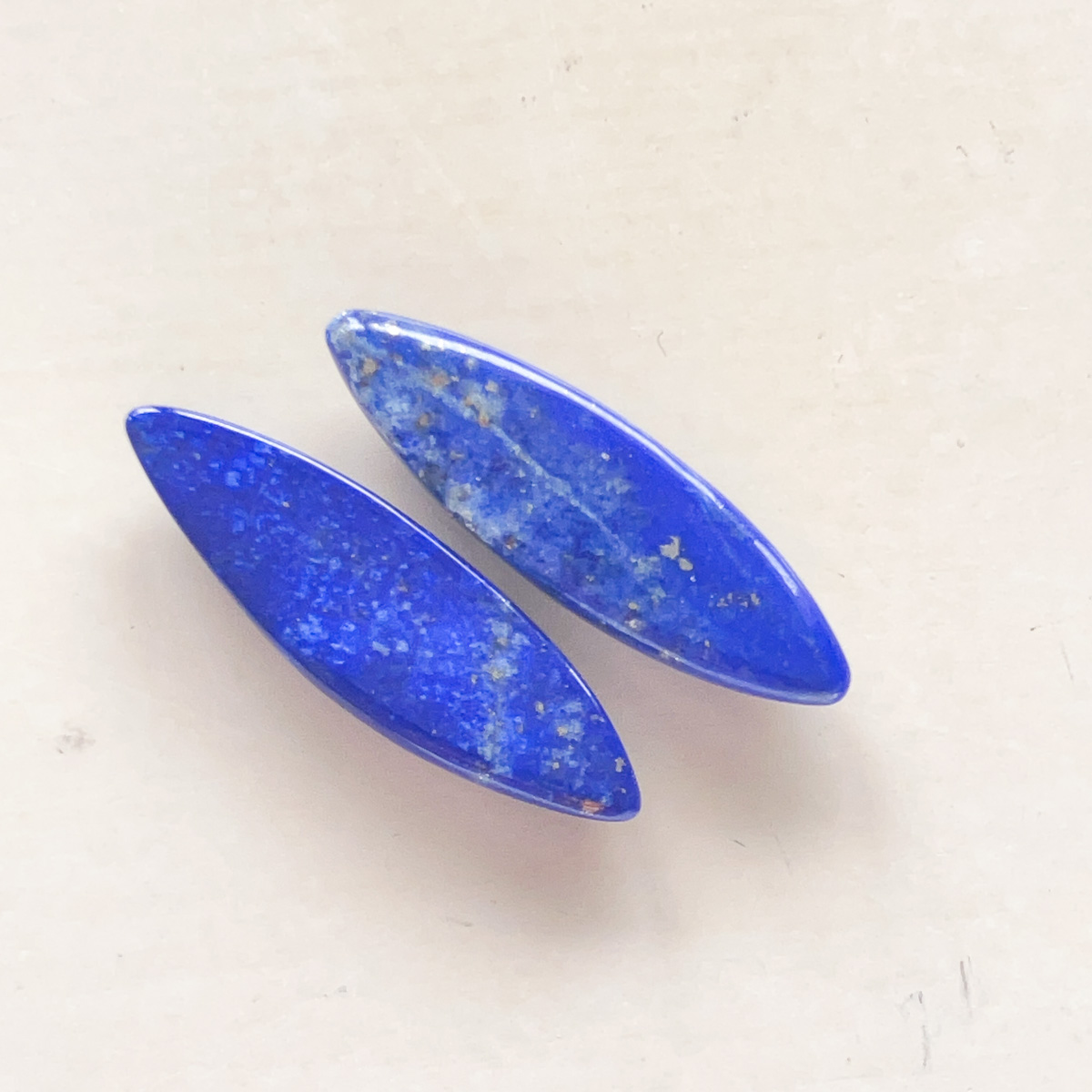 細長くすっきりとしたフォルムが印象的な、ラピスラズリのマーキス型ルースのペアです。